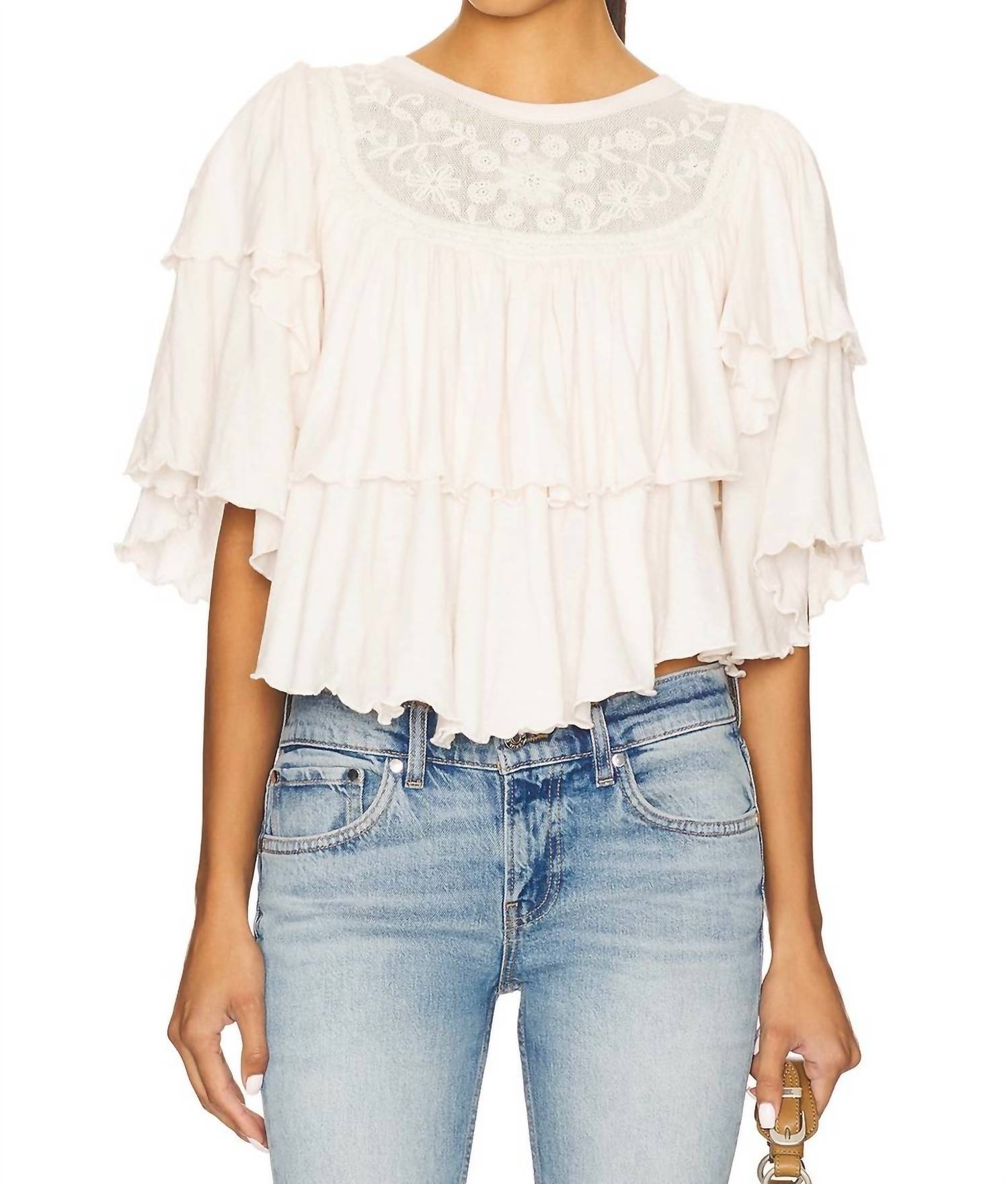 Look no further, you just found your perfect tee! The Rose Party Tee by Free People is an elegant top perfect for those seeking a touch of sophistication. Featuring elbow-length sleeves, this tee is composed of 100% cotton, enriched by a tiered textured design and delicate embroidered mesh panels. Originating from an unspecified location, it offers a pull-on closure for ease of wear. For care, simply machine wash. The model, with a chest measurement of 33.5", is 5'8" tall with a 28.5" waist and 40" hip, and is wearing a size small.