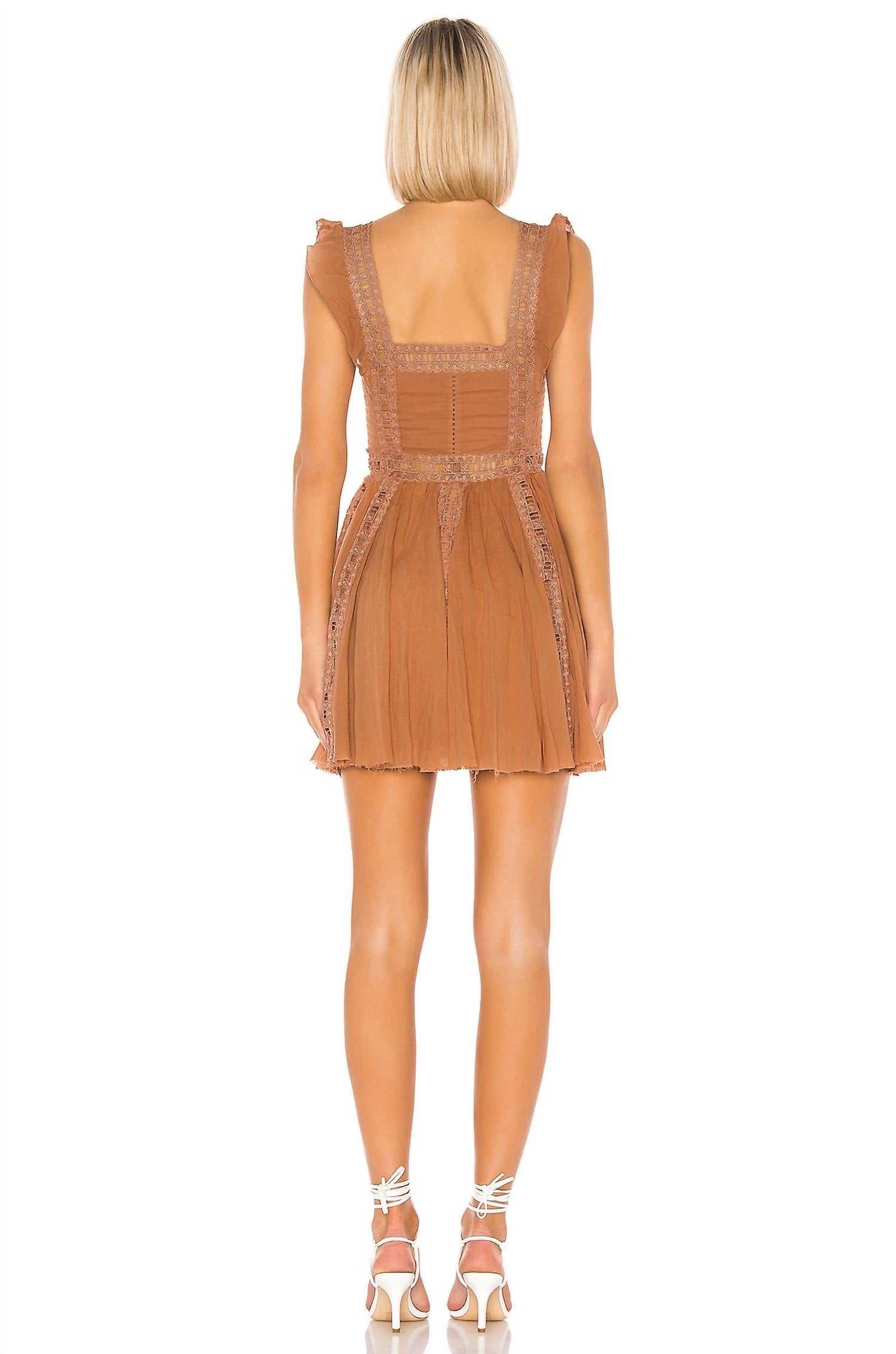 A short and breezy dress for those warmer days. Meet the Sleeveless Lace Mini Dress by Free People, an effortlessly chic piece for your summer evenings. Crafted from lightweight fabric, the dress features elastic crinkle side panels for a flattering A-line silhouette and a sophisticated square neckline. Composition includes a shell of 100% cotton and a full lining of 100% viscose. Closure: Zip closure. Length: 32 inches. Imported from India. Care: Hand wash cold. Style tip: Embrace the camel hue trend for a nostalgic nod to 90s fashion.