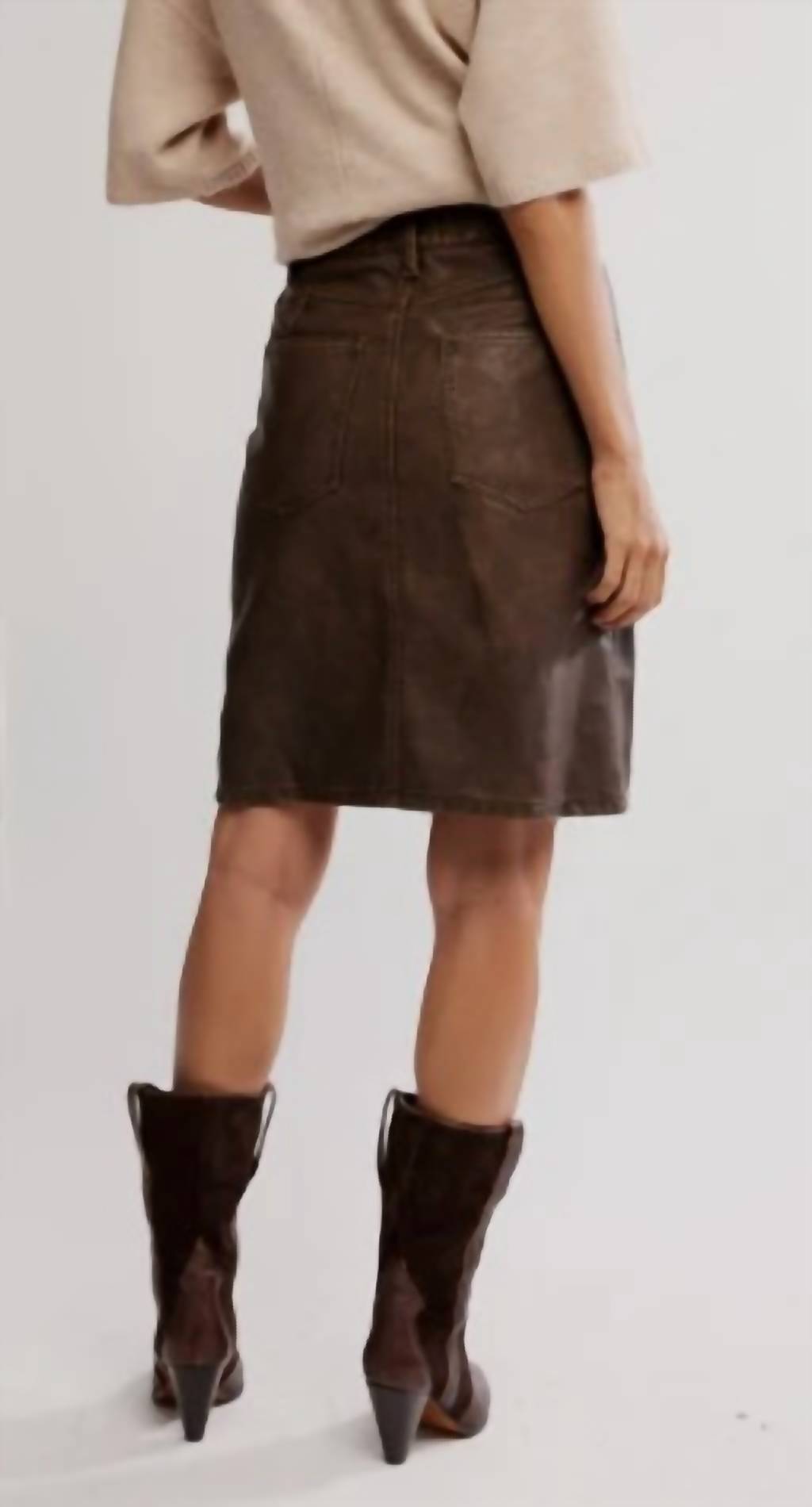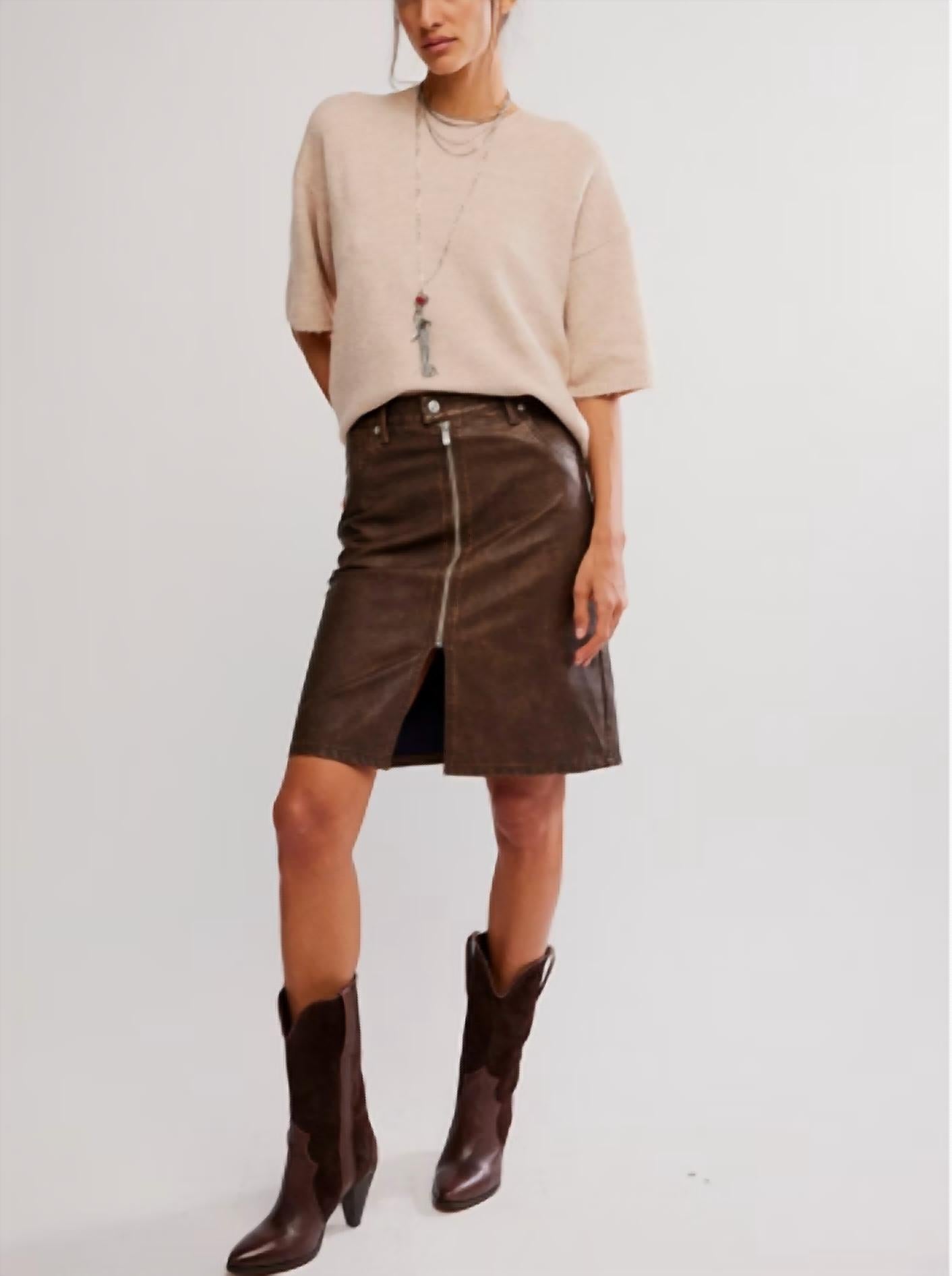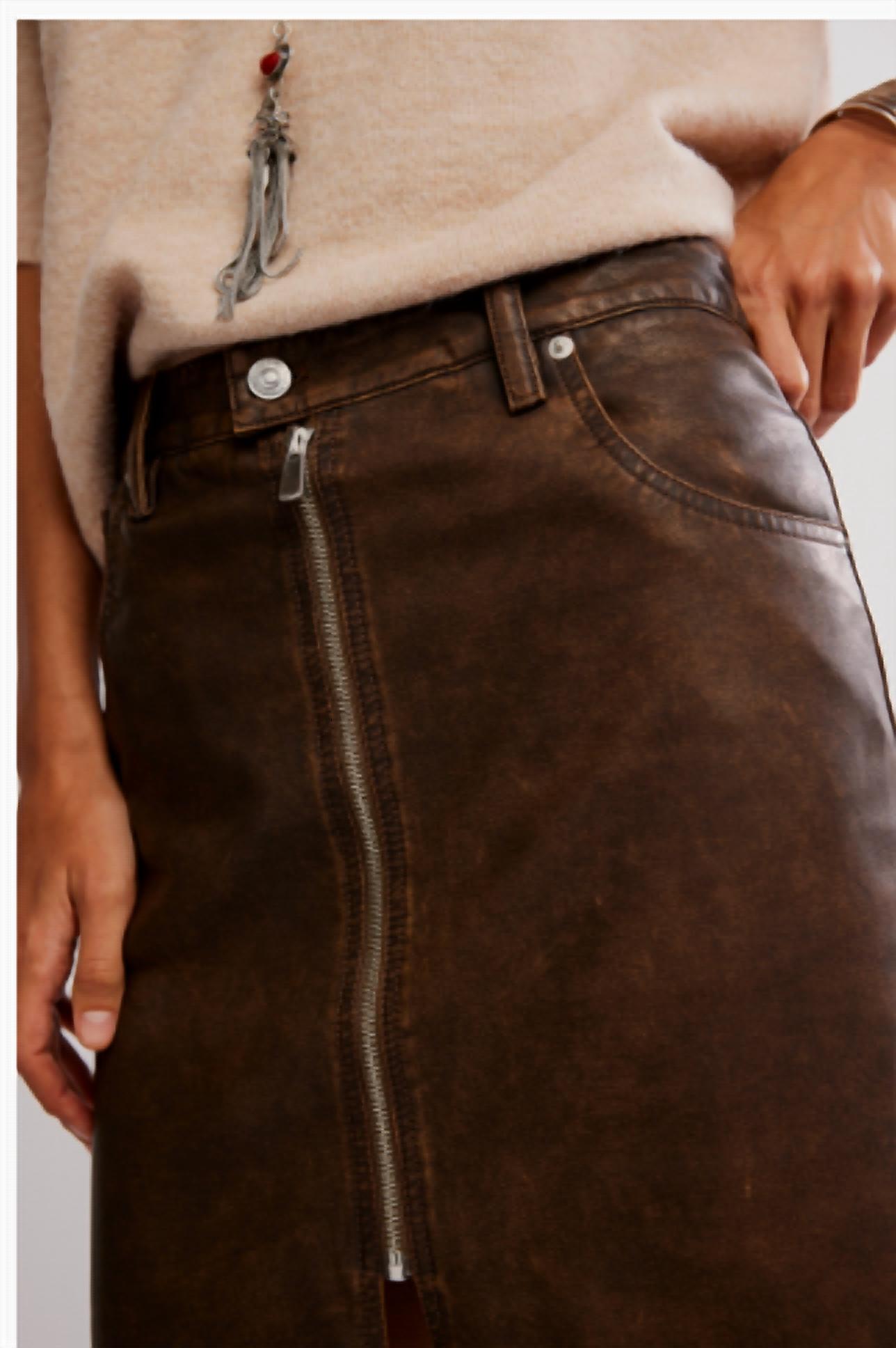 Show off just the right amount of skin in this beautifuly designed midi length skirt. Discover the Sycamore Vegan Midi Skirt from Free People, a daring addition to your fall wardrobe in a rich rusty hue. Crafted from buttery vegan faux leather, this midi features an edgy mid-rise design with an exposed zip fly and a classic column fit. The skirt is elevated by a vented hemline for added dimension and a practical five-pocket design. Closure: Button closure. Ideal for holiday parties and Thanksgiving celebrations with its vintage appeal.