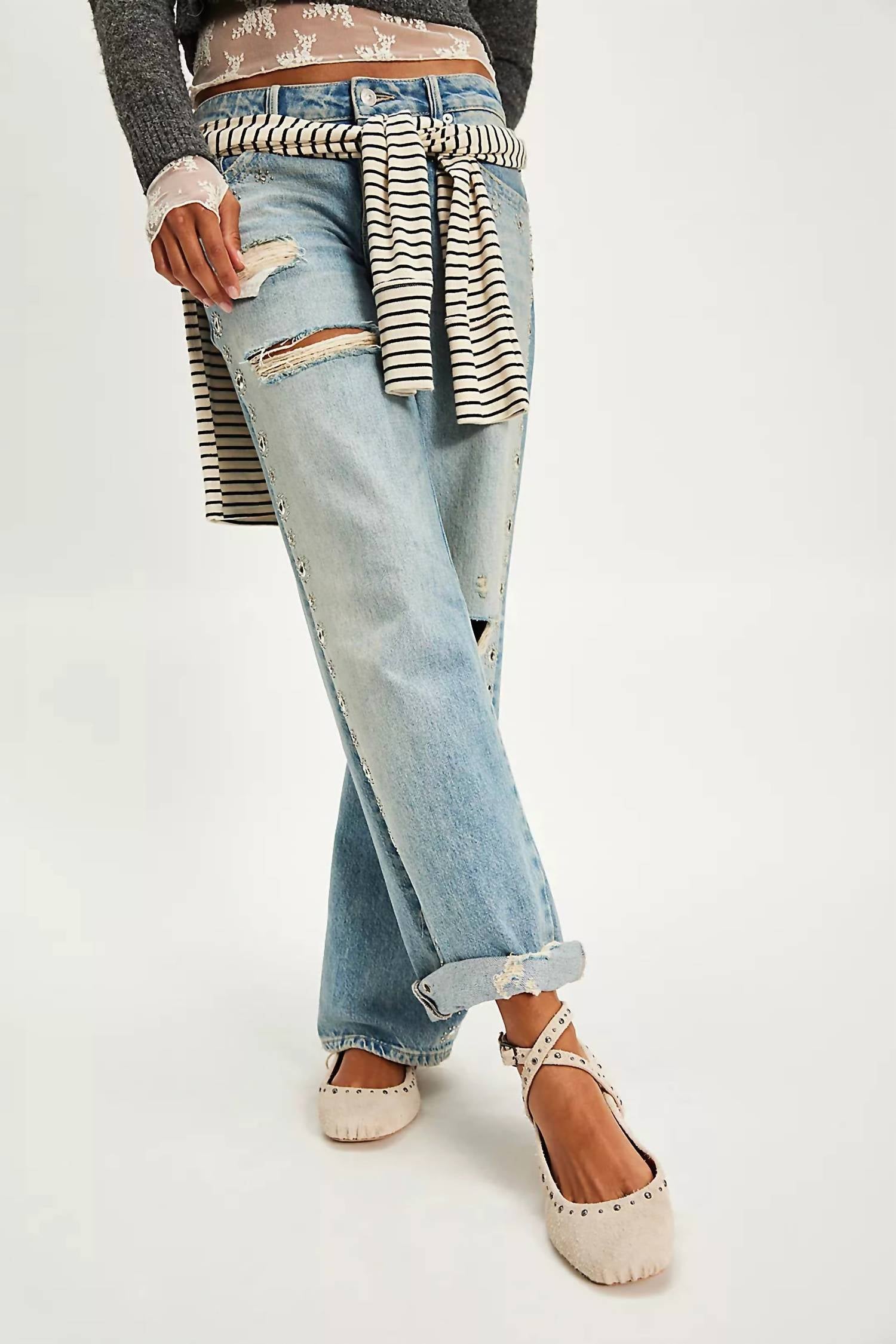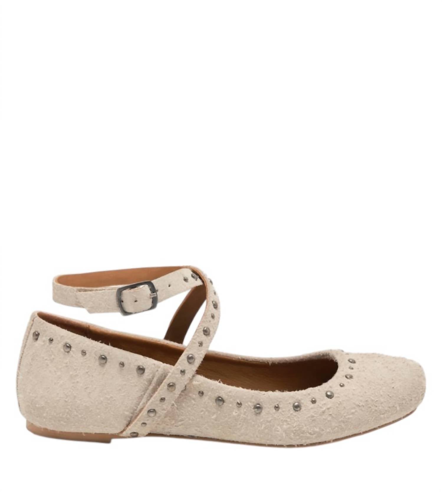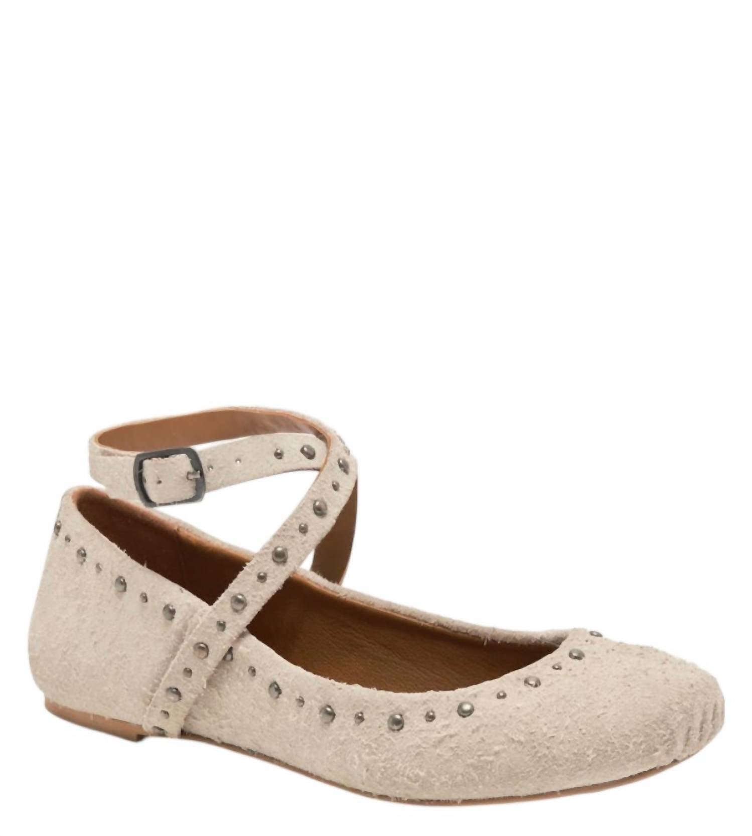 Loafers so versatile you can wear them with just about anything. Introducing the Women's Grace Gems Ballet Flat by Free People, a stunning combination of delicate design and edgy details in Sand Hairy Suede. These flats feature leather uppers with wraparound straps and adjustable buckles, all adorned with intricate studded details. Enjoy comfort and style with a round toe and flat rubber sole, perfect for pairing with anything from dressy skirts to casual jeans. Designed for the minimalist trend, these ballet flats are an excellent choice for spring and any dinner party occasion.