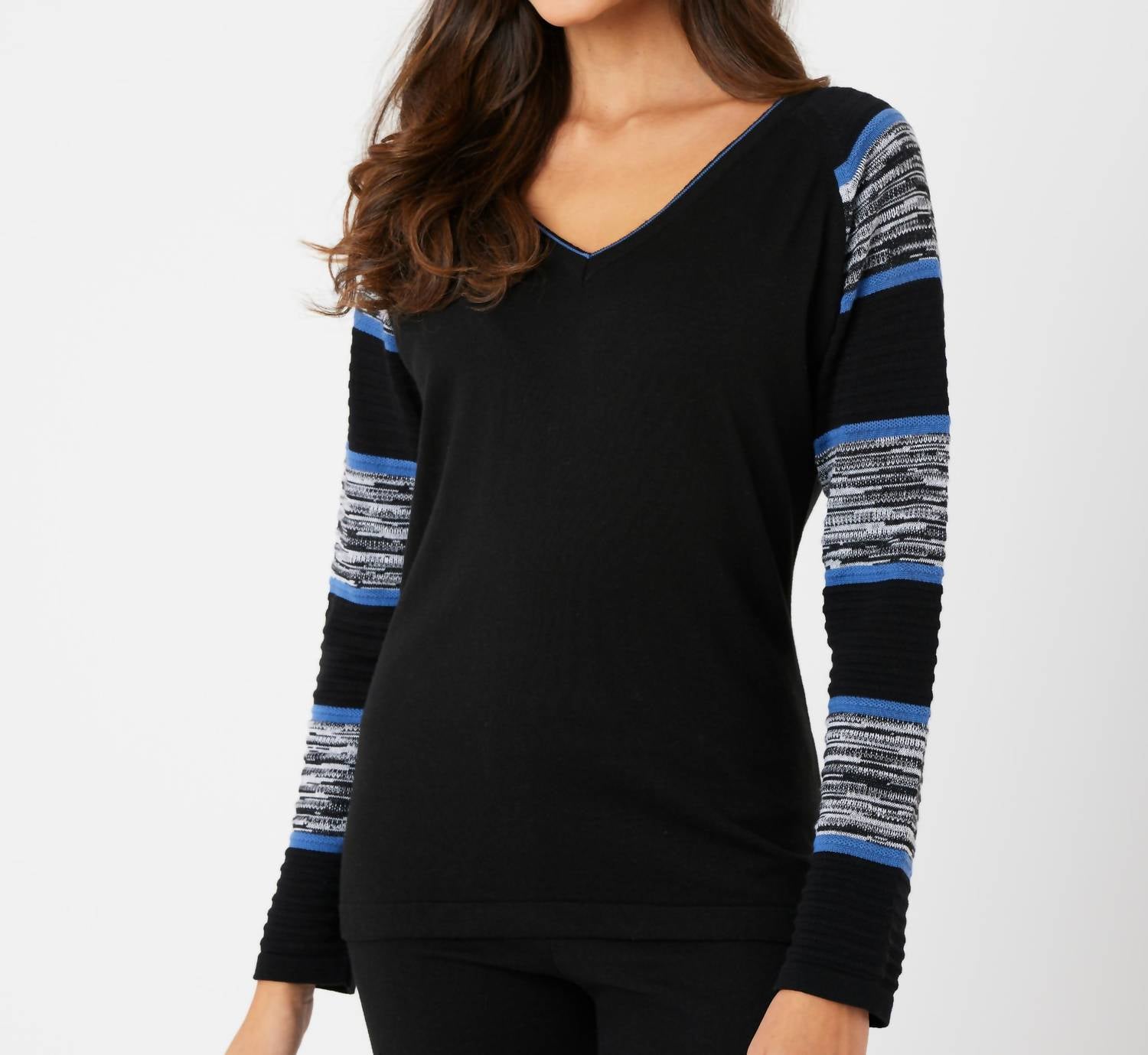 This Two Tone Sleeve V-Neck Top features a cotton/acrylic blend with a v-neck design and stylish two-tone detail. It hits at the hip, with a pull-on closure and can be hand washed or dry cleaned for care.