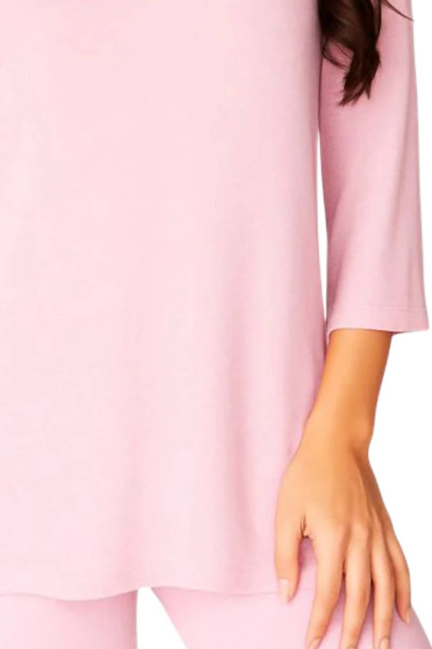 A perfect addition to any wardrobe, this classic tunic style blouse is flattering and effortless. You can easily transition from desk to dinner in this chic top. Discover the Tatiana Kashmira 3/4 Sleeve Tunic Top by French Kyss, a must-have for your spring vacation wardrobe. This minimalist tunic, in a delicate pink hue, features a flattering V-neck and hits at the hip. Crafted from a soft viscose blend of 79% Viscose, 18% Polyester, and 3% Elastane, this imported piece is designed for comfort. With a pull-on closure, it's easy to wear, and for care, simply hand wash or opt for a dry clean.