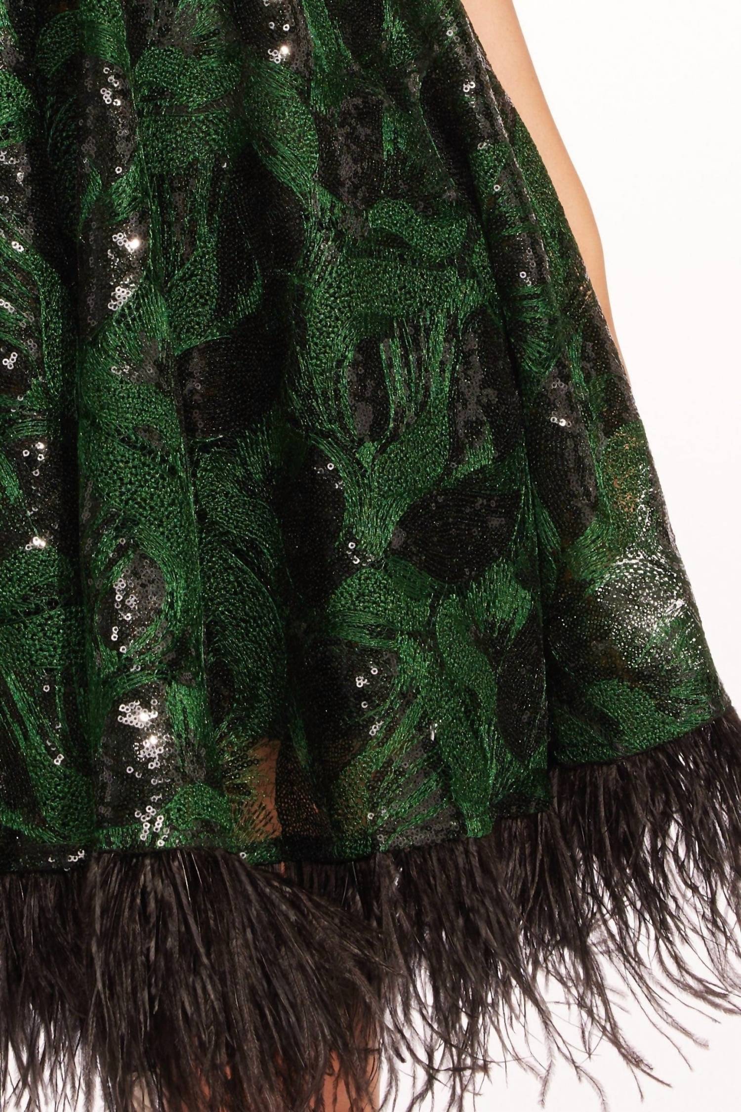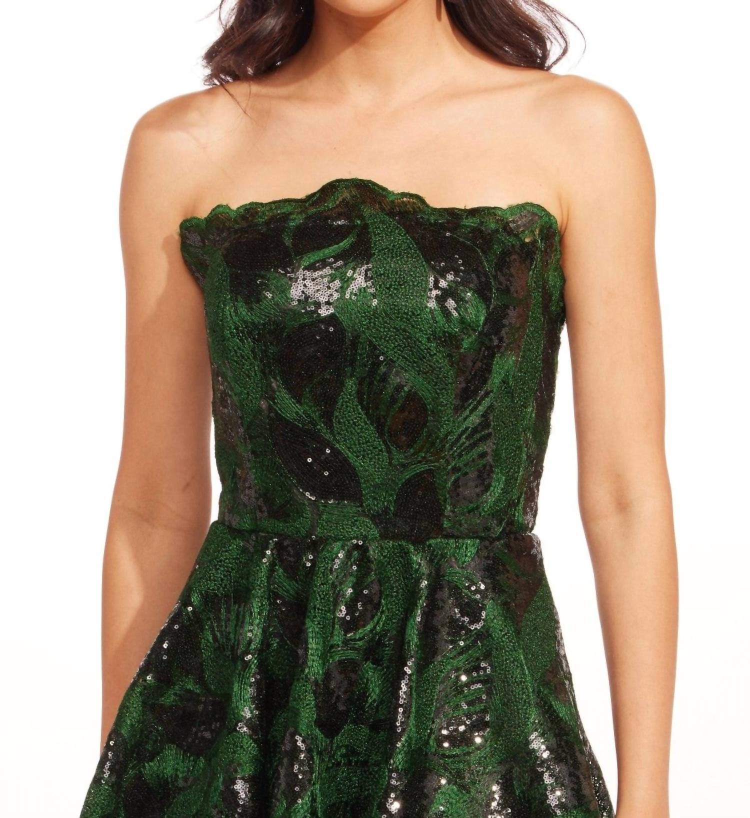 This strapless midi dress is a show-stopping piece featuring feather embellishments, fit and flare silhouette, and intricate embroidery with sequins. It includes a back zip closure and is made from 100% polyester with a 100% polyester lining. Dry clean only. Made in Los Angeles USA.