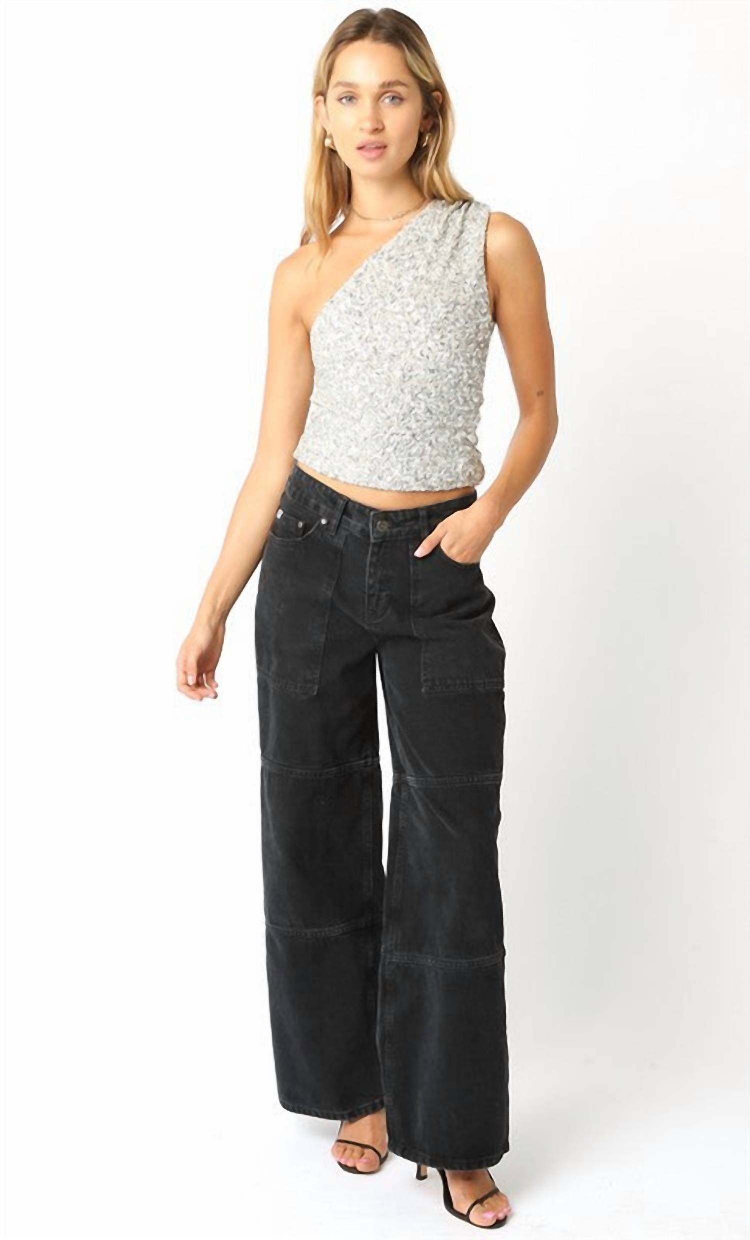 Pair this crop top with your favorite high-waisted jeans or maxi skirt. Introducing the Mia One Shoulder Sequin Top by OLIVACEOUS, a striking piece designed to dazzle in Champagne Silver. This sleeveless crop top showcases a chic off-the-shoulder asymmetric neckline, ideal for making a bold statement. Crafted with a woven texture, the garment consists of 95% polyester and 5% spandex, ensuring a comfortable fit. Closure type is pull-on, providing easy wearability.