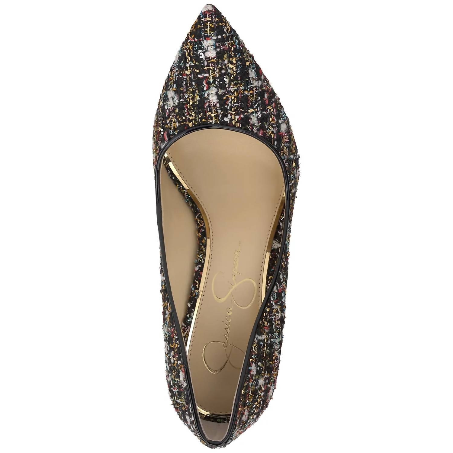 Pair these beauties with your favorite skinny jeans or dress for a night out on the town. Step into elegance with the Cassani Pump by Jessica Simpson, perfect for adding a touch of sophistication to any ensemble. These Black Sparkle Tweed heels feature a pointed toe style and a striking stiletto heel, with a height of 3-9/10 inches. Crafted with a man-made upper and sole, these pumps beautifully combine durability and design. Ideal for adult women seeking a high fashion statement in their footwear collection.