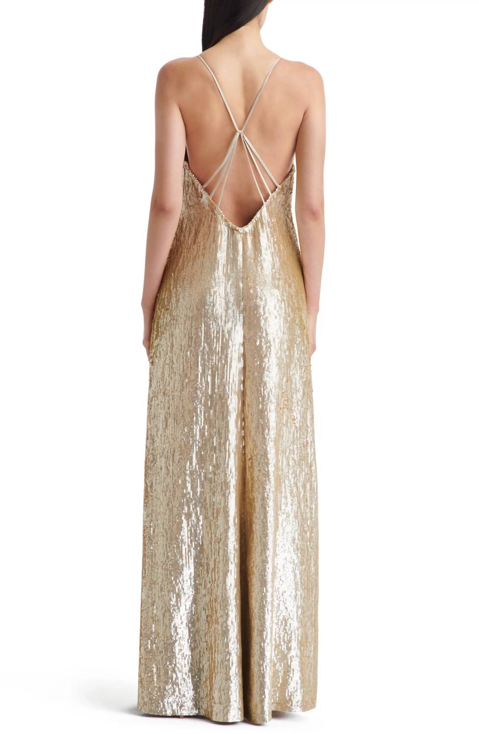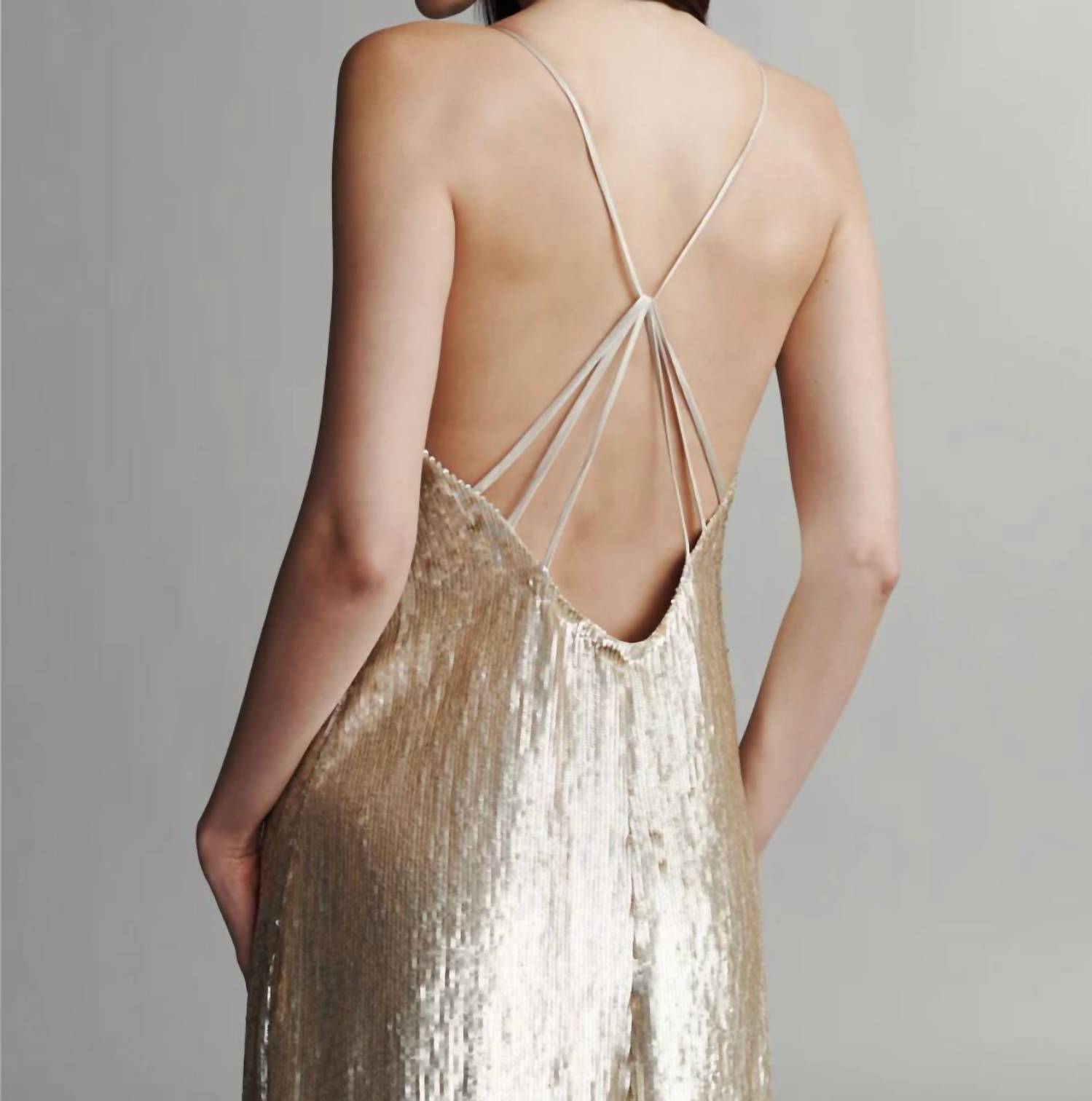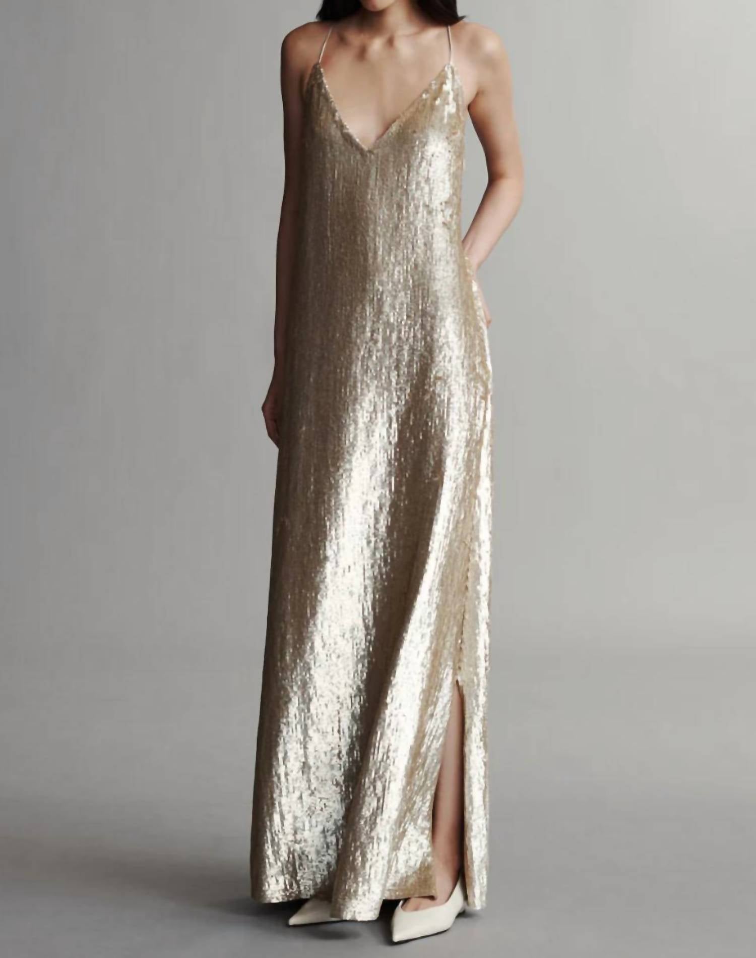 Who doesn't love a good maxi dress? This one you'll be reaching for season after season. Elevate your evening wardrobe with the Josephine V-neck Maxi Dress by TWP, an elegant choice for black-tie events. This sleeveless sheath dress boasts a luxurious 100% silk construction, lined for added comfort, and features a dazzling array of hand-sewn sequins in a rich gold hue. With a sophisticated V-neckline and an open back with adjustable cross straps, it gracefully drapes into a floor-length silhouette. Care: Dry clean only.