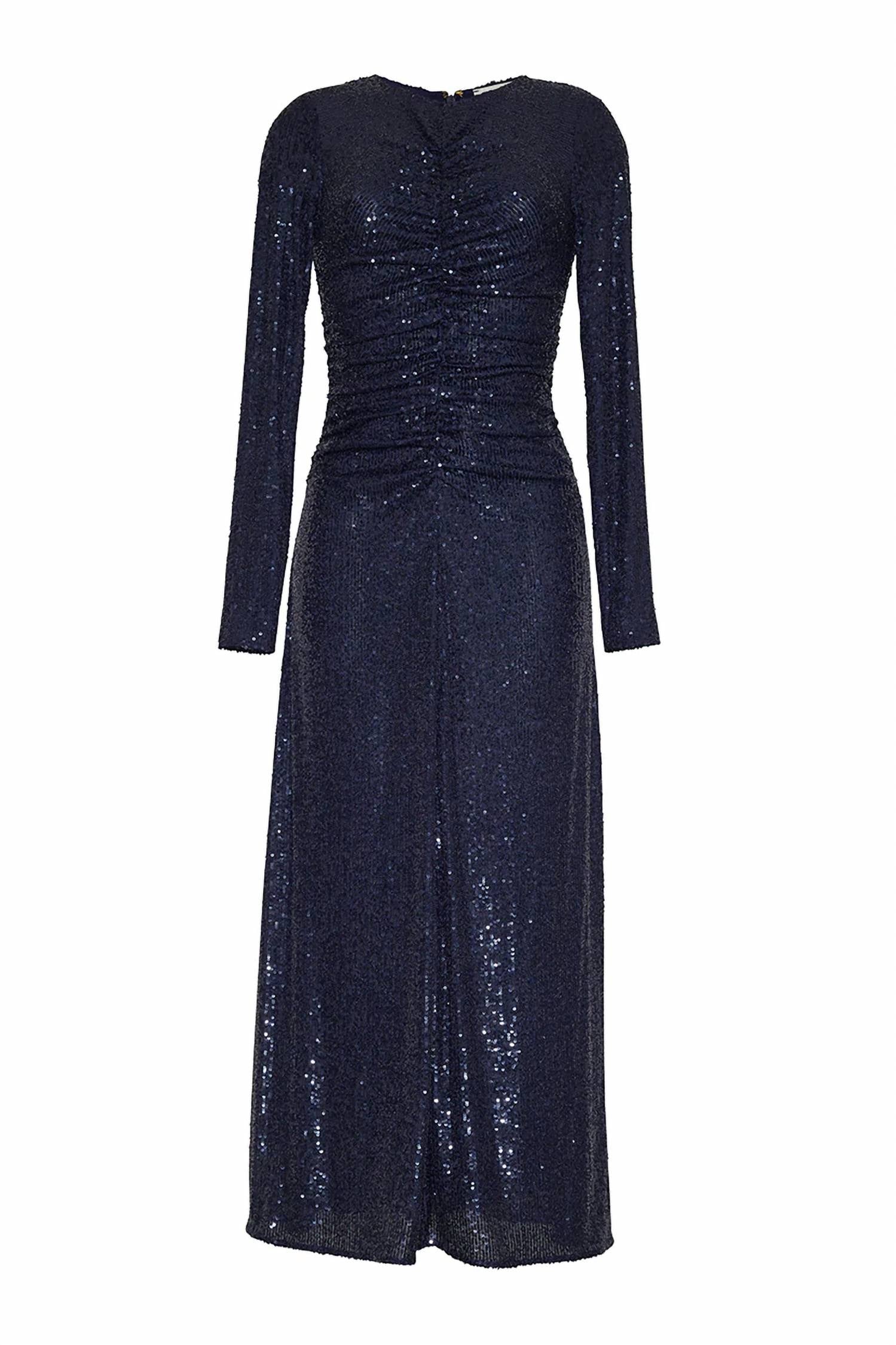 Stylish long sleeves and a flattering A-line silhouette. Crafted from 100% polyester with a poly mesh lining and sequin embellishments. Chic garment in Midnight Sequins. Ensures elegance and comfort. Invisible back zip with hook-and-eye. Dry clean only or hand wash cold. Made in China.