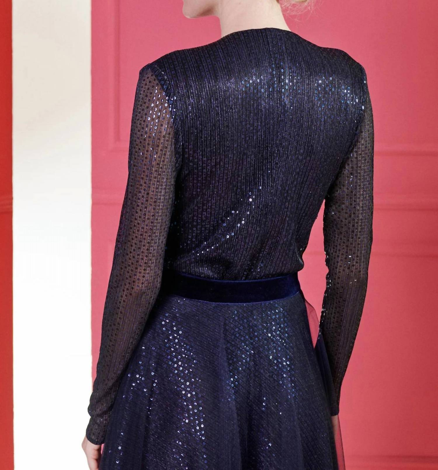 Form fitting and comfortable - this bodysuit check all of the boxes. Elevate your evening ensemble with the Talbot Runhof Micro Sequin Voile Bodysuit in a stunning Majestic Blue. This women's bodysuit features long sleeves and a refined V-neckline, perfect for any elegant occasion. Crafted from 100% Polyester, it boasts a unique textured pattern with exquisite sequin embroidery that sets it apart, while the lining is composed of 55% polyester and 45% metal. Made in Germany, it offers a sleek and seamless fit that requires no pockets, making it the ideal option for sophisticated events.