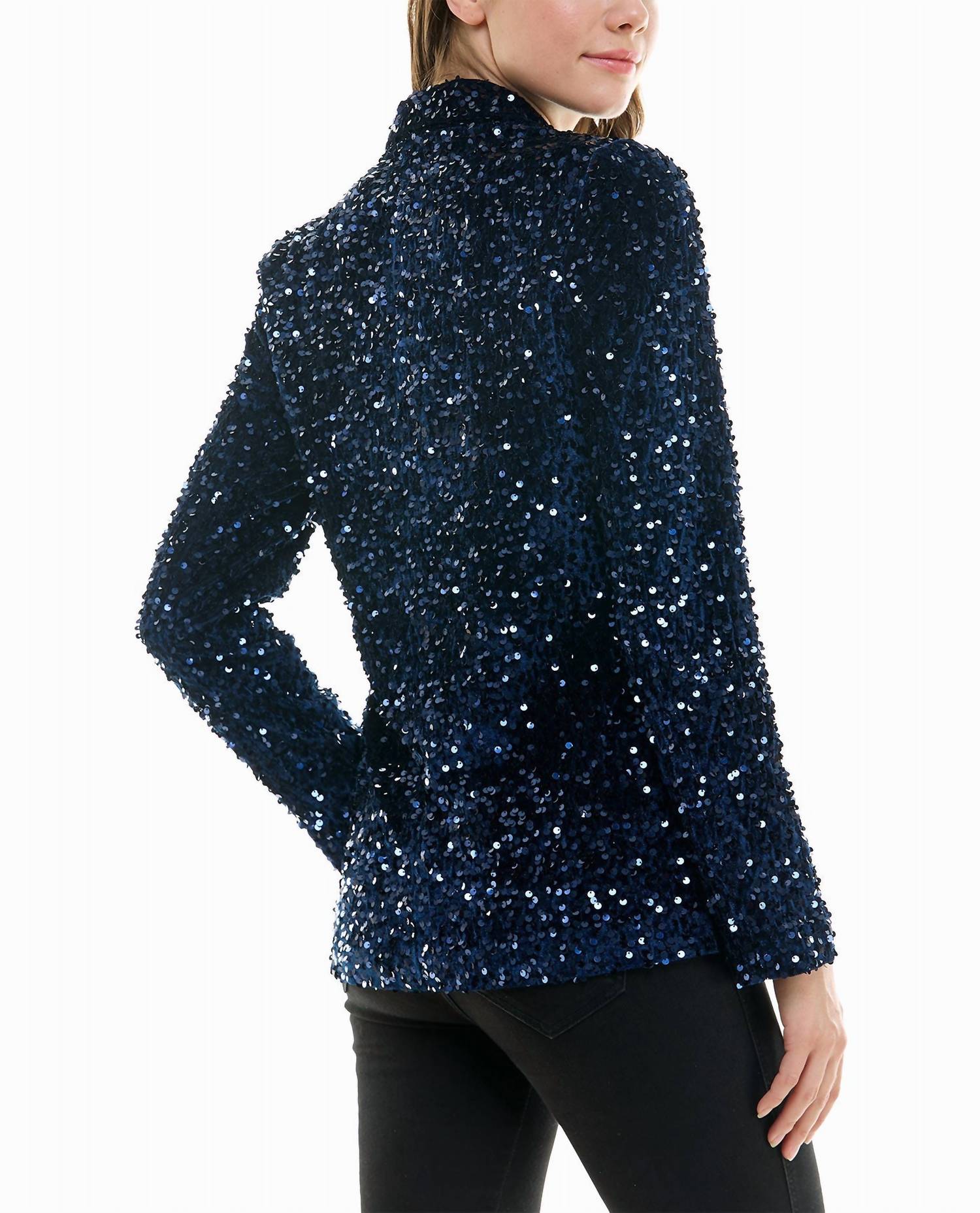 This Velvet Sequin Jacket is crafted from a blend of 97% polyester and 3% spandex. Sequined velvet material exudes opulence. Long sleeves, collar, and a button closure. Handle with care: turn inside out, hand wash cold separately, avoid bleach, twist gently to drip dry, and do not iron or dry clean.