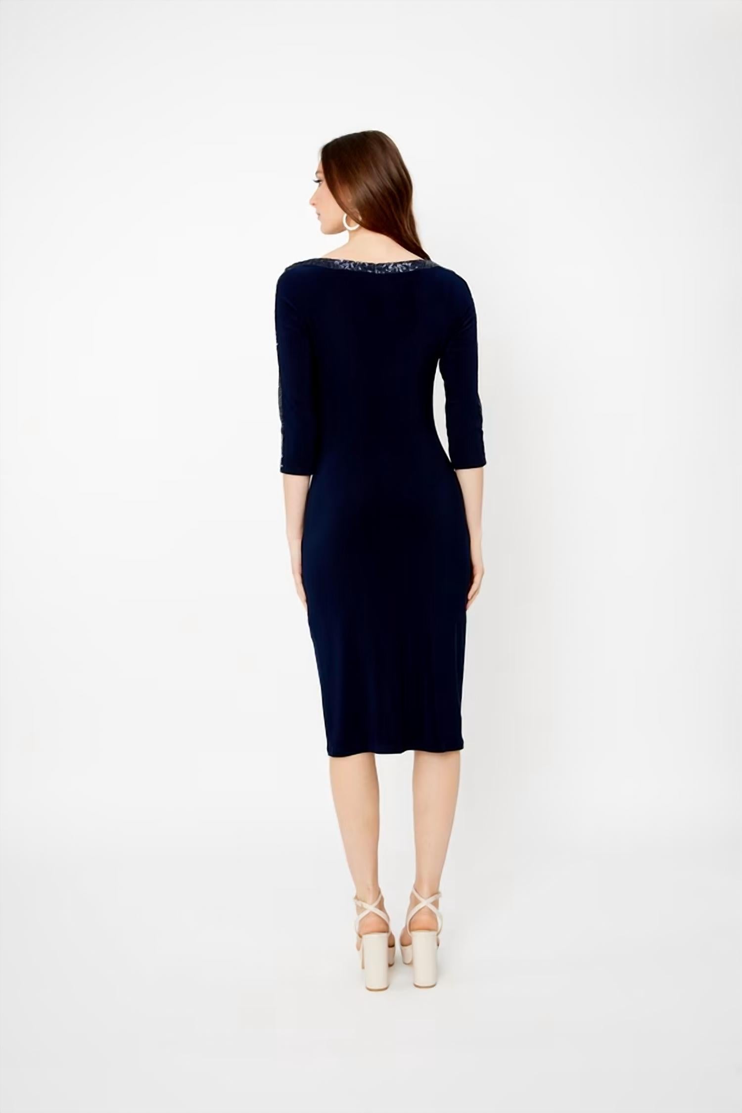 The perfect length dress does exist. The Joseph Ribkoff Sequined Sheath Midi Dress in stunning Midnight Blue is the embodiment of timeless elegance. With its three-quarter sleeves and boatneck design, this dress features a sequined bodycon silhouette perfect for summer events or the 4th of July celebration. Crafted in Canada from 96% Polyester and 4% Spandex, it boasts a flattering midi length of approximately 41 inches. The back zip closure ensures a smooth fit, and the fabric is treated to resist creasing. Care instructions: Hand wash in cold water, lay flat to dry, and avoid ironing or tumble drying. Model is 5'9" and wears a size 6.
