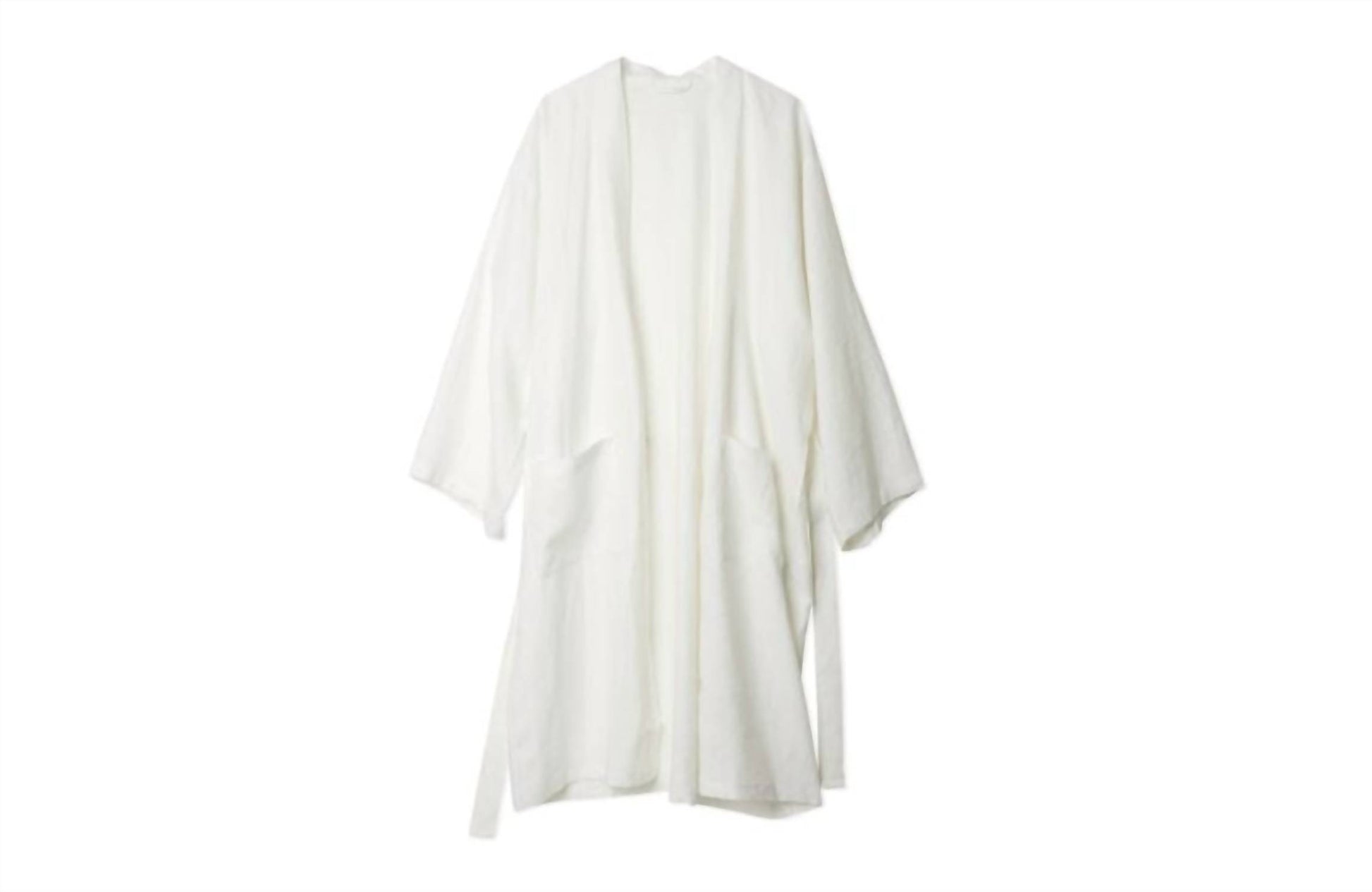 Introducing the Linen Drawstring Robe by Piglet in Bed, an effortlessly stylish piece characterized by its solid white color and minimalist design. This women's robe features long sleeves and a flattering v-neck, crafted from 100% natural stonewashed linen for ultimate comfort. Its relaxed, oversized fit includes a drawstring and two large pockets, making it perfect for a summer vacation getaway. Care: Machine washable.