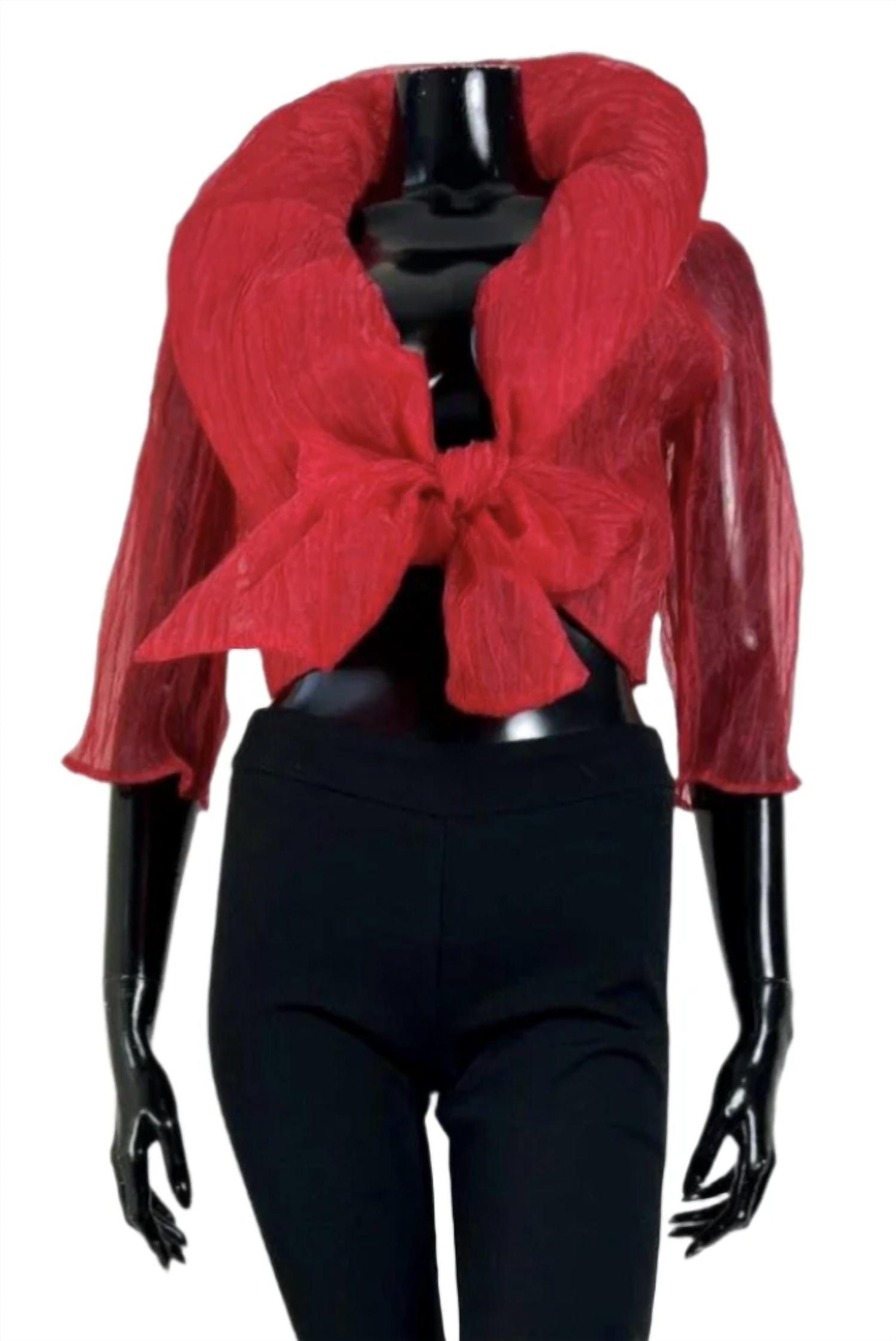 Add this to any outfit for a perfeclty polished look. Introducing the Crinkle Bolero by Samuel Dong, a stylish addition to any wardrobe in sleek black. Made from crinkle organza, this bolero offers a chic overlay to elevate your ensemble. With two size options, Size 1 fits XXS to M with a chest of 40.5", shoulder width of 15.75", and center back length of 17", while Size 2 accommodates L to XXL with a chest of 44.5", shoulder width of 16.75", and center back length of 18". Ideal for layering over your favorite outfit, it is a sophisticated choice for formal or casual occasions.