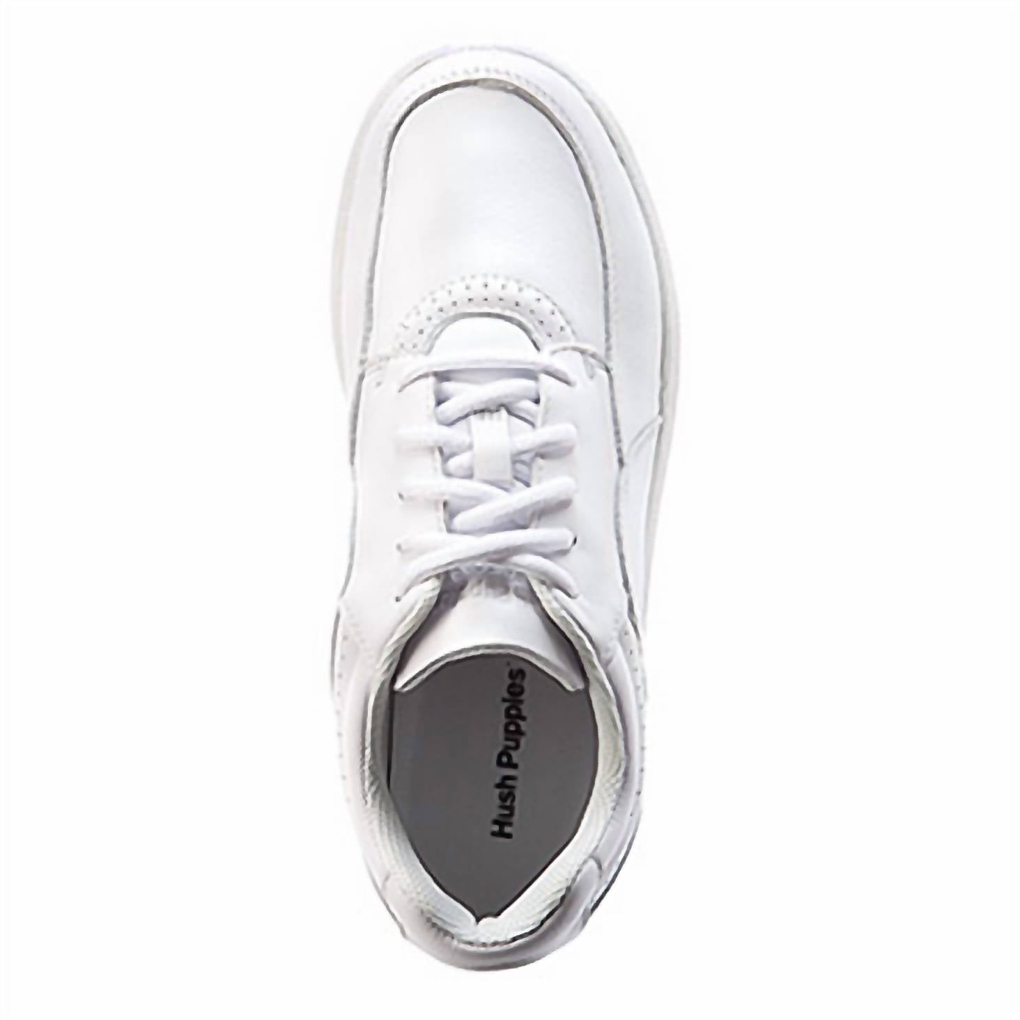 Cute, functional, and comfortable. These sneakers check all the boxes. The Hush Puppies Women's Power Walker Shoes in white are crafted for exceptional comfort and durability. Made from high-quality leather, these sneakers feature a round toe shape and a flat heel, ideal for summer wear. Patented Bounce® technology enhances your step with added spring, while the moisture-wicking Dri-Lex® lining keeps your feet dry. The removable molded footbed ensures lasting comfort throughout the day.