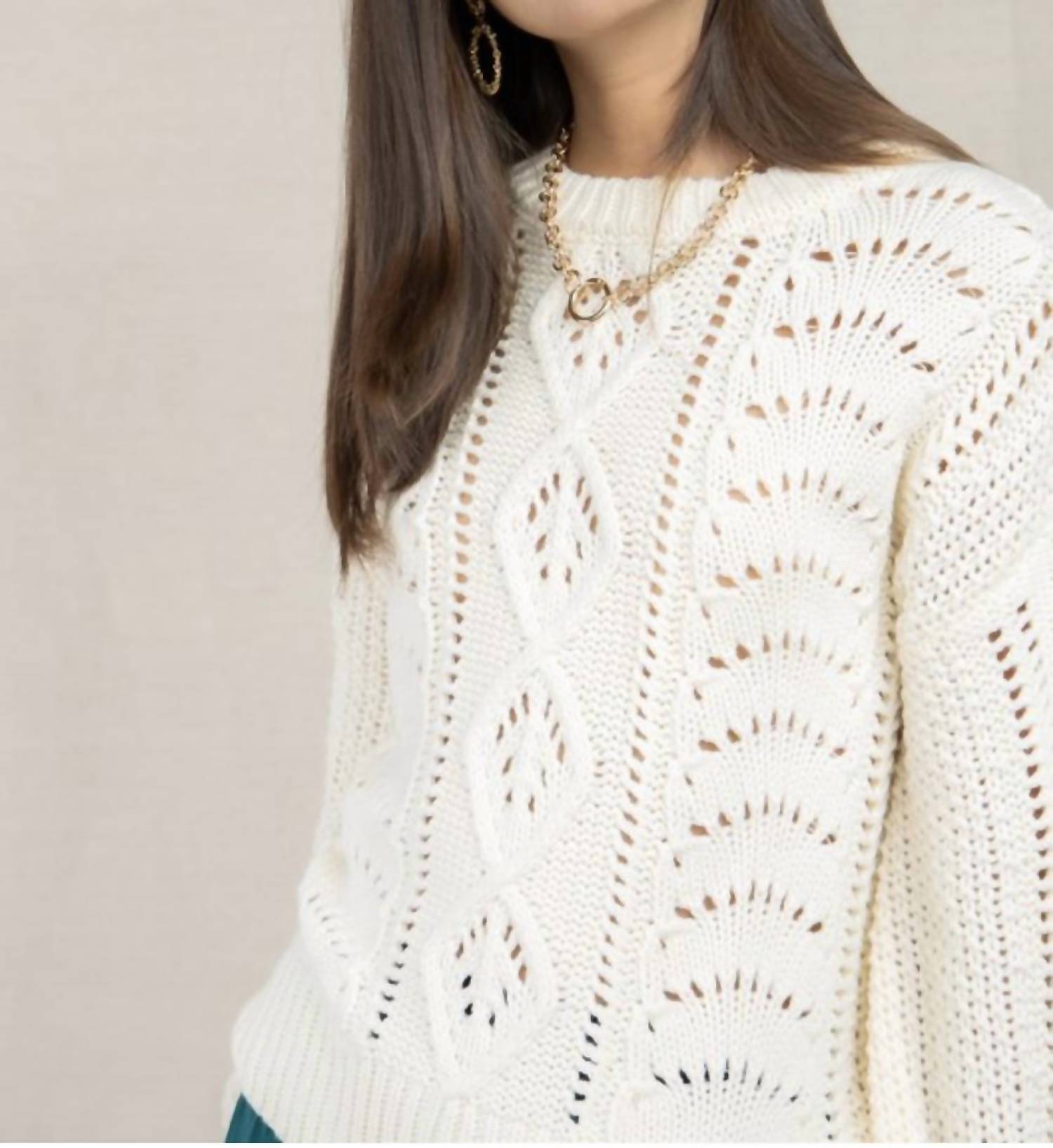 The ultimate go-to sweater, expertly crafted to provide the perfect combination of warmth and style. Its classic design and soft fabric make it a must-have addition to your wardrobe. Cable Knit Round Neck Sweater True to size Waist Length Great for any cup size Not fitted, comfortable room through midsection Semi-sheer May be worn with any bra Woven fabric Super soft knit Accent sleeve Cable knit design throughout SELF: 74% Acrylic 22% Polyester 4% Spandex CARE Hand wash cold Wash with like colors Hang to dry in a shaded area Let It Snow Cable Knit Round Neck Sweater features a light ivory hue and relaxed fit silhouette. Designed with a crew neckline and long accent sleeves. Elevated with a ribbed hemline!
