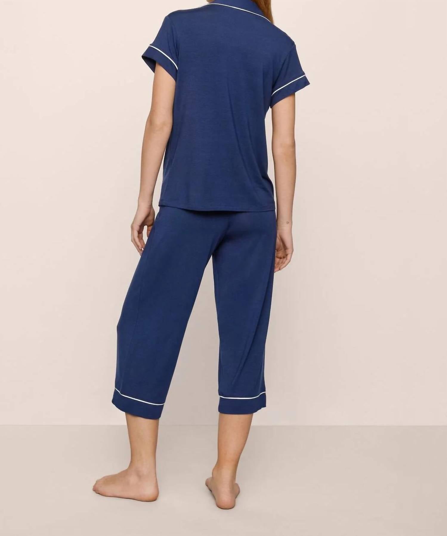 The perfect piece to lounge in, sleep in, and cook breakfast in. Experience ultimate comfort in the Eberjey Gisele Tencel™ Modal Short Sleeve Cropped Pajama Set, a perfect choice for minimalist, relaxed evenings. This set in Navy Ivory features a short sleeve top with a button front closure and a single chest pocket, complemented by cropped pants with an elastic waist and contrast piping detail. Crafted from 95% Tencel Modal and 5% Spandex, this pajama set offers temperature-regulating properties. Care instructions include machine wash and tumble dry, ideal for effortless maintenance.