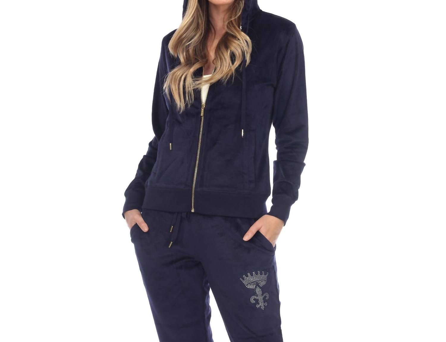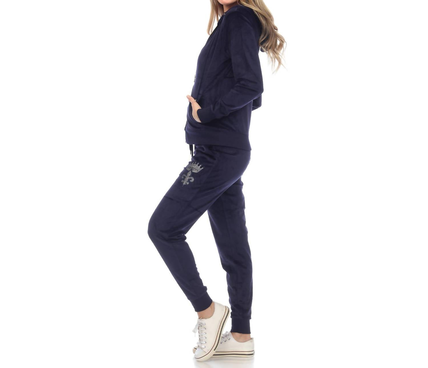 Loungewear doesn't have to be frumpy and this is exactly what we had in mind. Designed for a comfortable fit, this chic little number will be your favorite lounging-at-home look. An all-time favorite in the softest velour with famous fitted style. Tracksuit Set includes a zip up hoodie and sweatpant, 2 front half-kangaroo pockets, ribbed cuff and a full zip closure. Rhinestone embellishments are found on both pieces, forming dazzling patterns and designs you won't be able to miss!