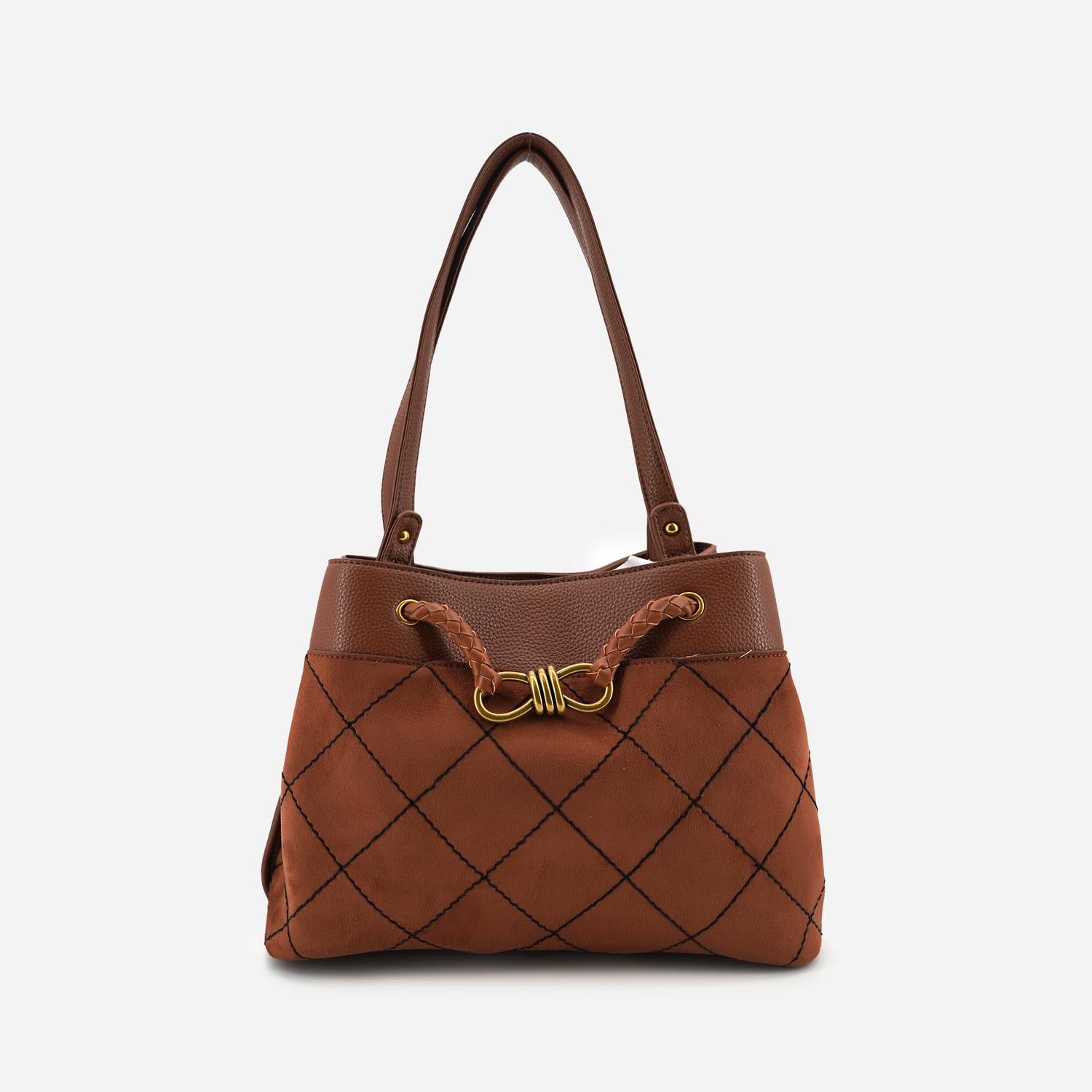 The perfect throw-it-in-and-go bag for your next weekend away or beach vacation! Its classic design will never go out of style and you'll be reaching for this bag season after season. The Women's Velvet Knot Quilted Shoulder Tote Bag by Like Dreams is a stunning accessory in chic brown. Crafted from suede and vegan leather, it features gold bow hardware for a touch of luxury. This tote measures 12''W x 9''H x 5.5''D with an 11" top handle drop and offers a magnetic/zipper closure for added security. Inside, you'll find two inner slit pockets, one inner wall zipper pocket, and a zipper pocket compartment divider.