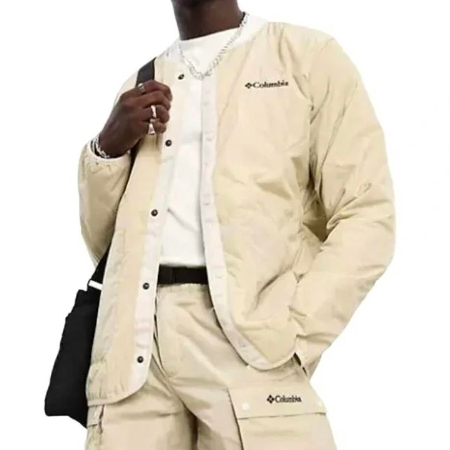 Discover the Doverwood Crinkle Fabric Quilted Insulated Jacket by Columbia, a perfect addition to your travel wardrobe. This solid beige jacket features long sleeves and a stylish snap closure. With its lightweight design, it's ideal for fall outings and Thanksgiving gatherings. Designed for comfort and utility, this piece includes practical side pockets, adding functional style to your streetwear ensemble.