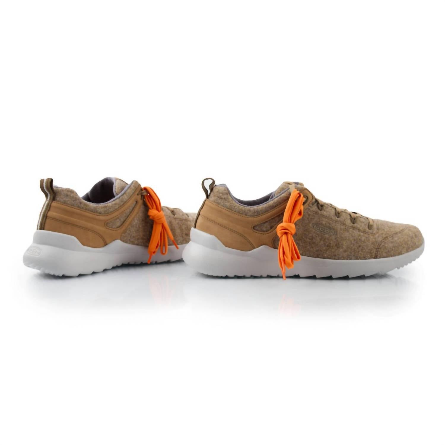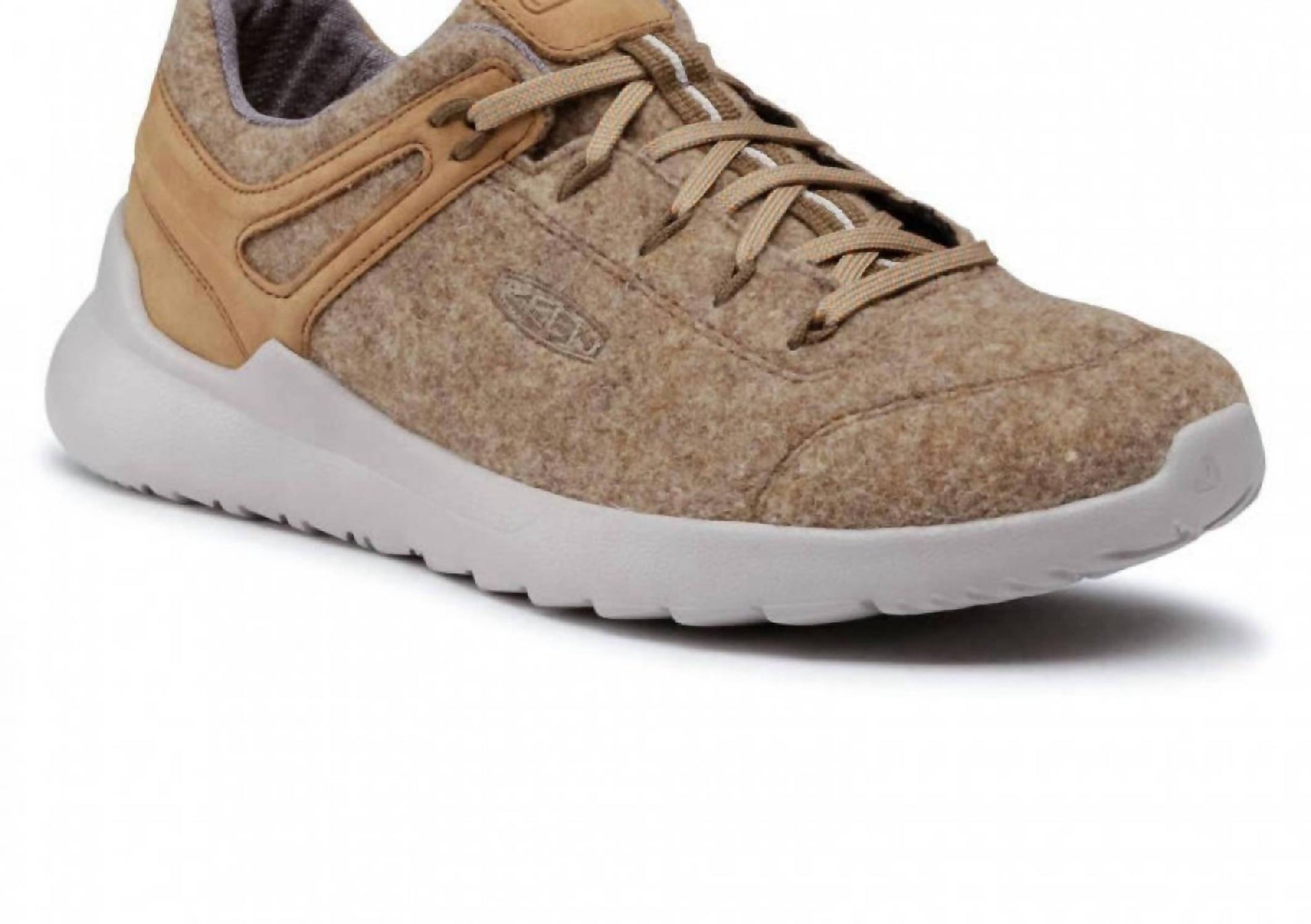 Introducing the Men's Highland Arway Hiking Boot Shoes by Keen, blending style and sustainability with 50% recycled wool and leather upper. These brown sneakers provide comfort with a cushion that relieves the Achilles tendons and a sneaker-like fit for ultimate versatility. The non-marking EVA midsole and rubber outsole are designed for all-day comfort and durability. Care for these medium-width, flat heel, round toe shoes with light brushing; do not machine wash. Ideal for athleisure trends and perfect for spring camping adventures.
