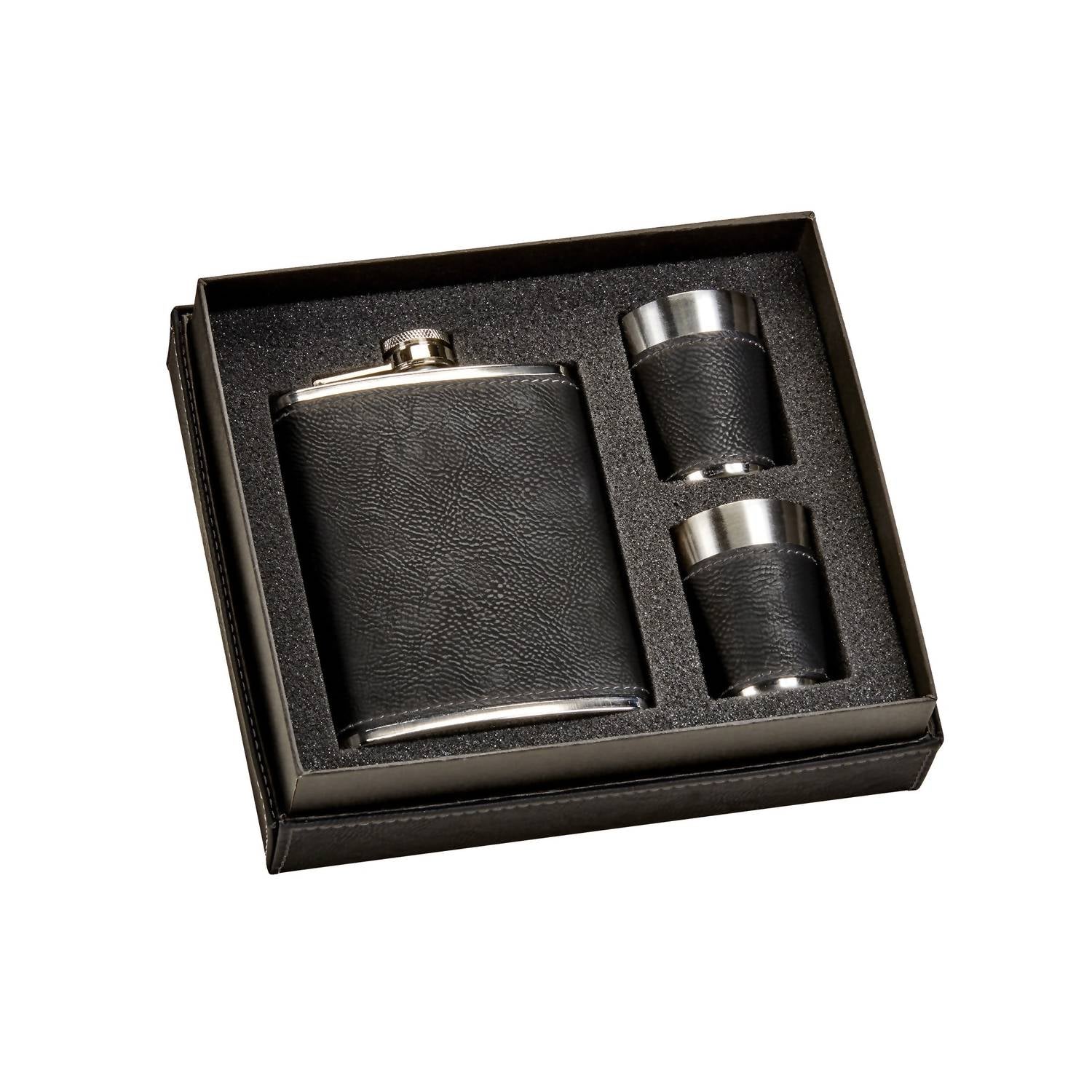 An 8 oz stainless steel flask, encased in black leatherette. Includes two matching shot glasses and a striking gift box with cover. Easy to clean and maintain, ensuring long-lasting enjoyment.