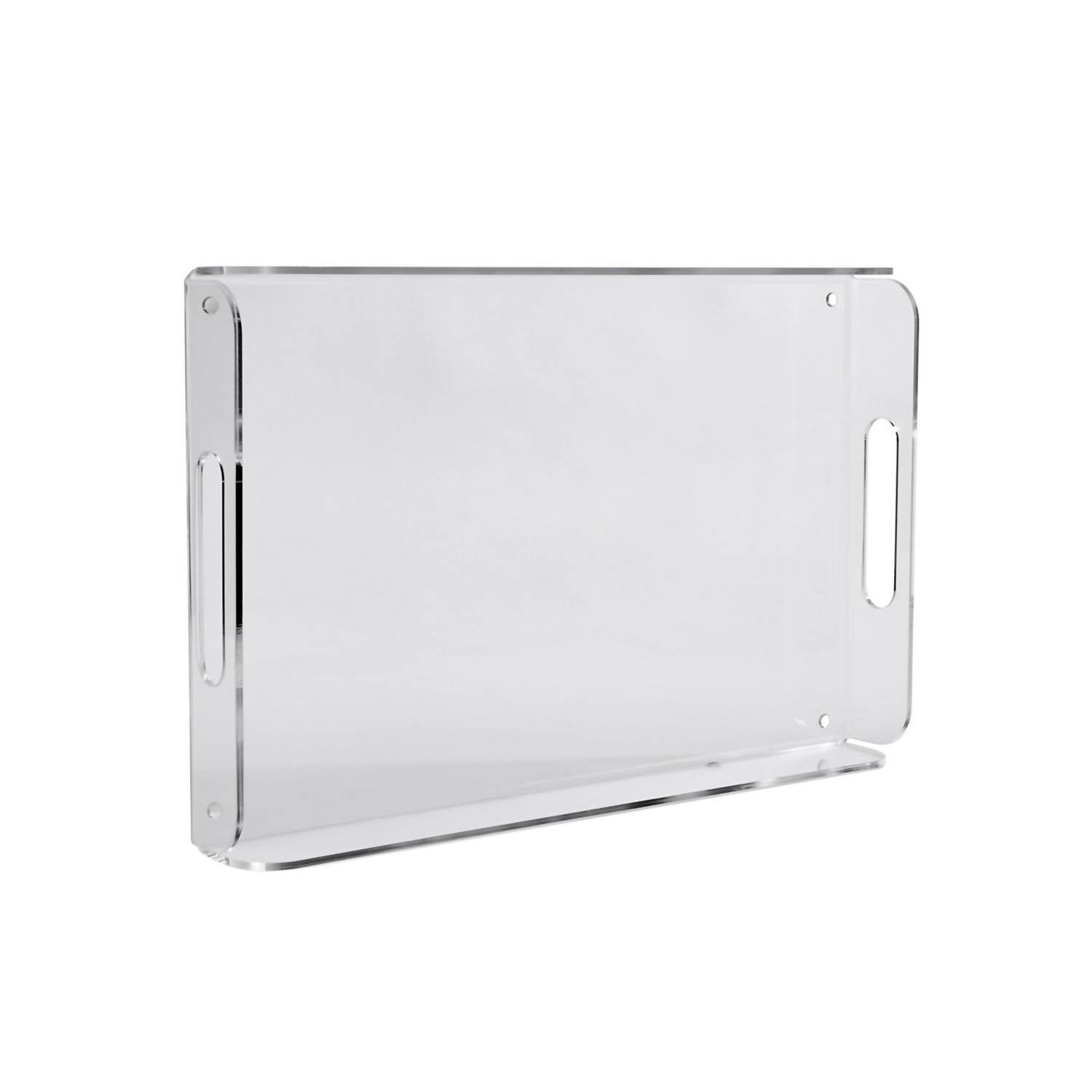 6.5" L x 10.5" W x 2" H. Material: Durable acrylic. Hand wash recommended to maintain the clarity and integrity of the acrylic.