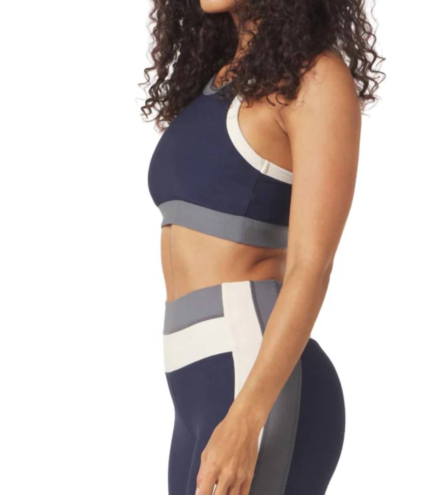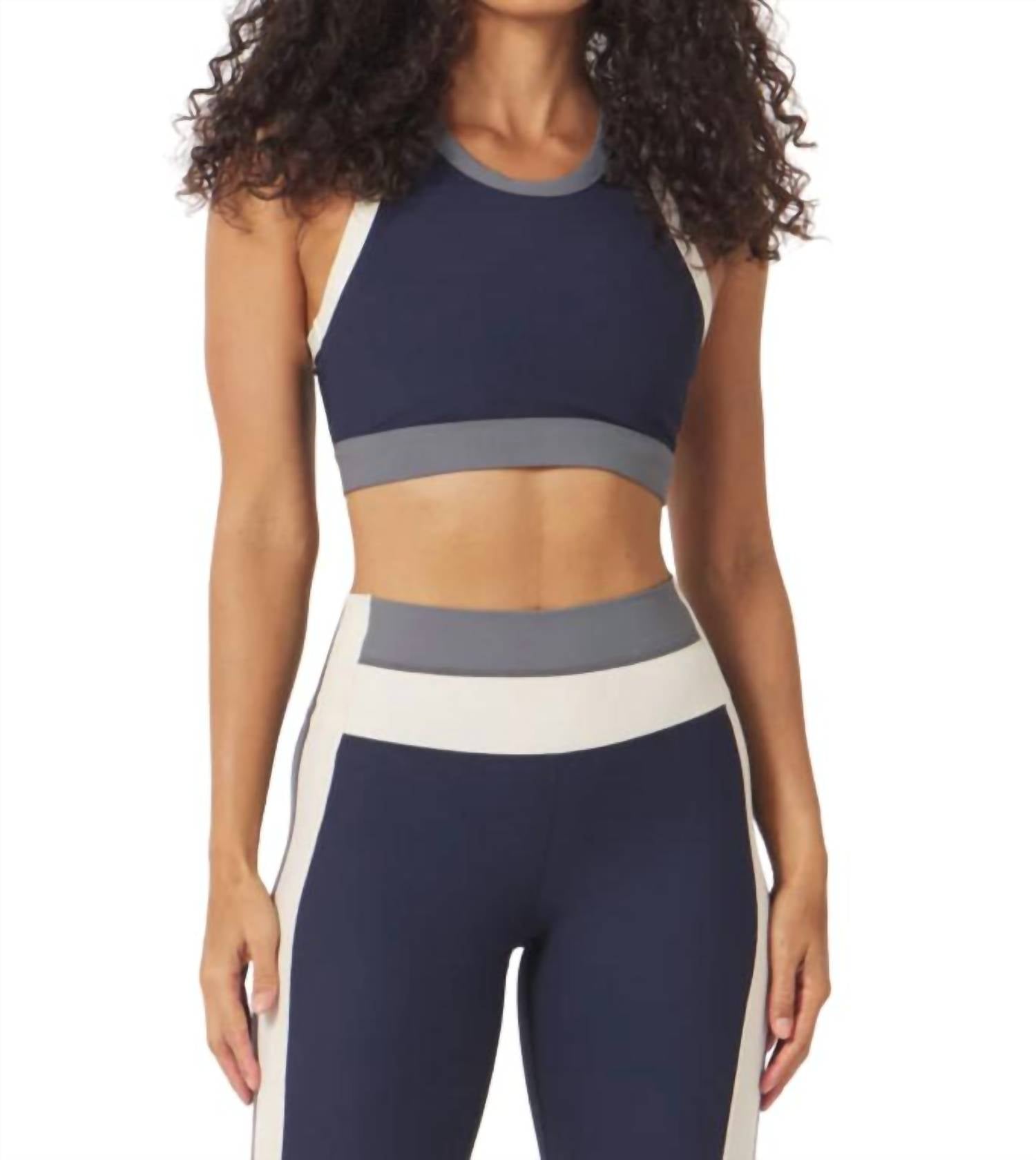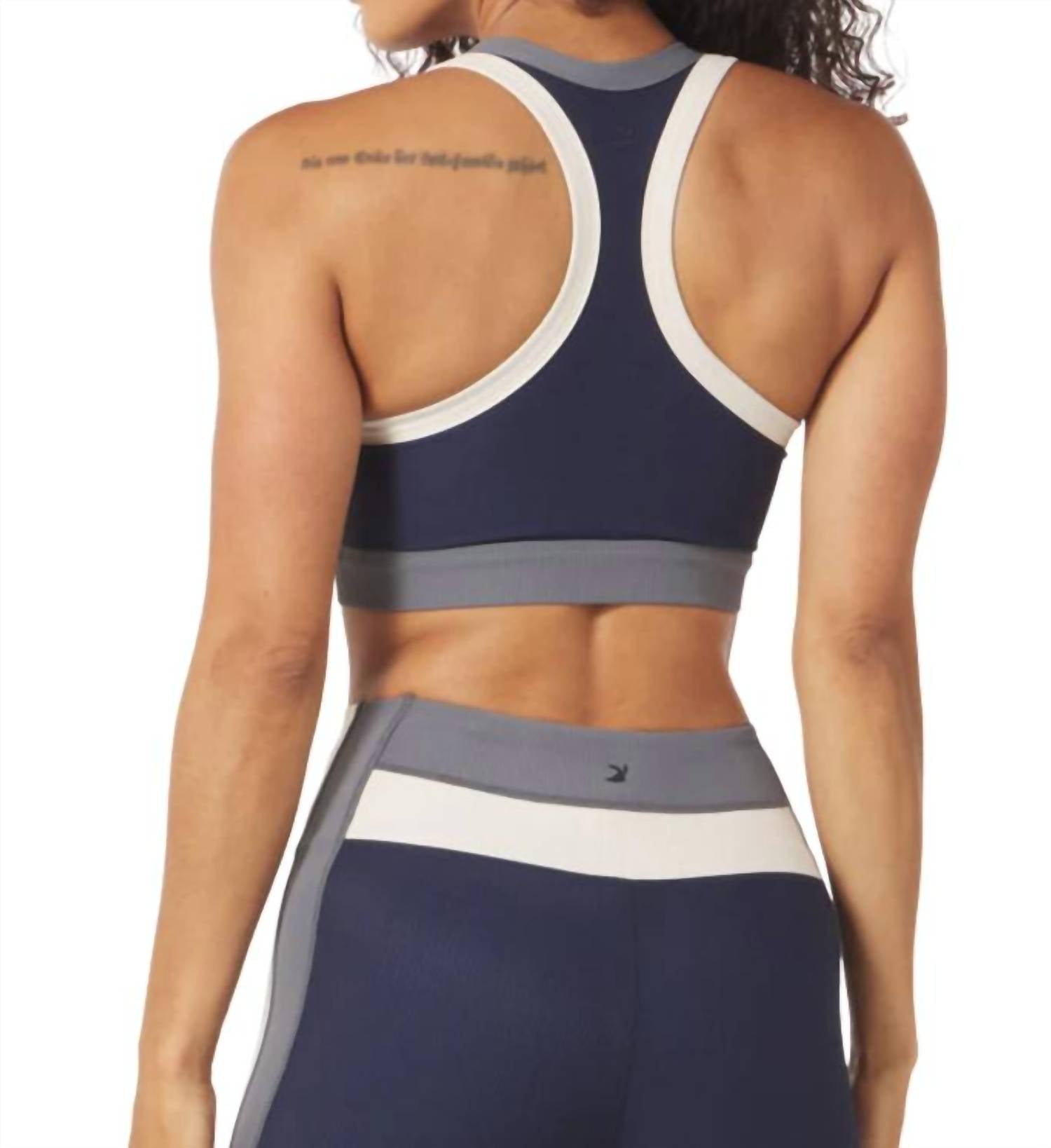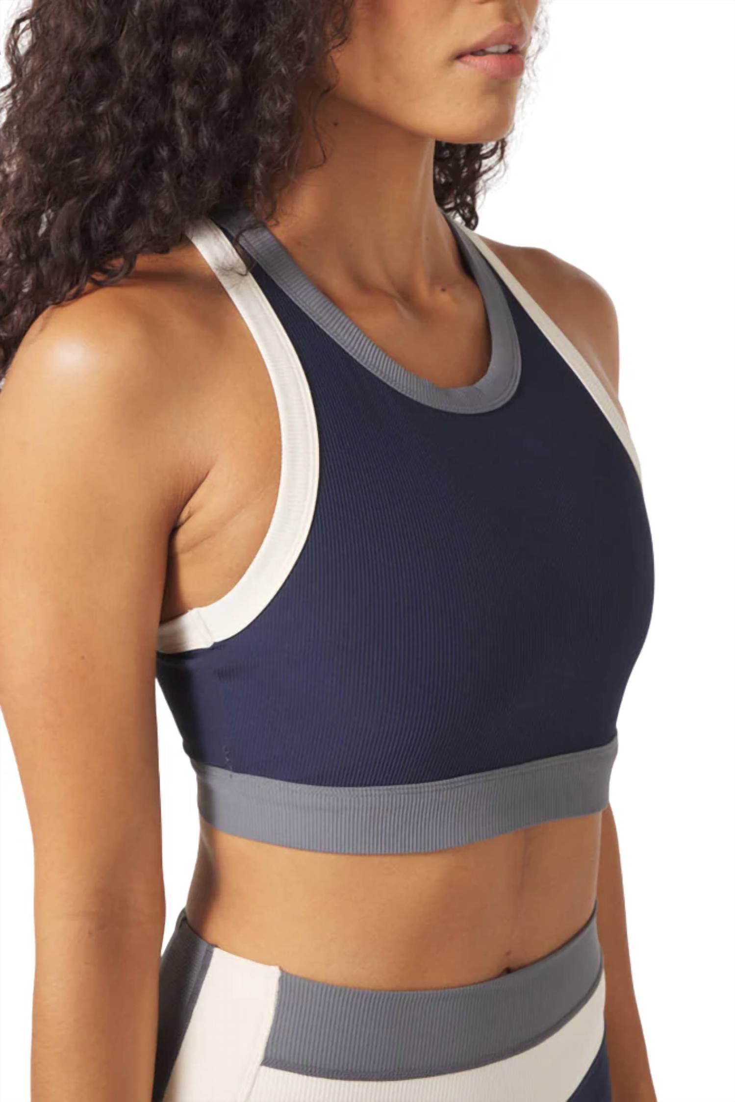 The most comfortable and supportive sports bra you'll own. Sporty-chic piece in a striking White/Navy Stripe perfect for your summer fitness routine. With a high neck racerback design, offers medium impact support and features two-tone contrast ribbed trims. Made from advanced SCULPT RIB fabric, delivers both performance and comfort. Hand wash.