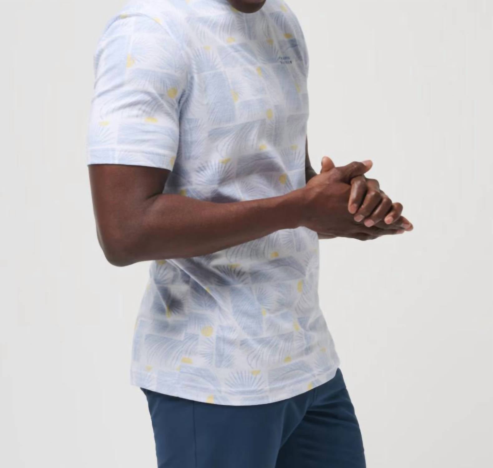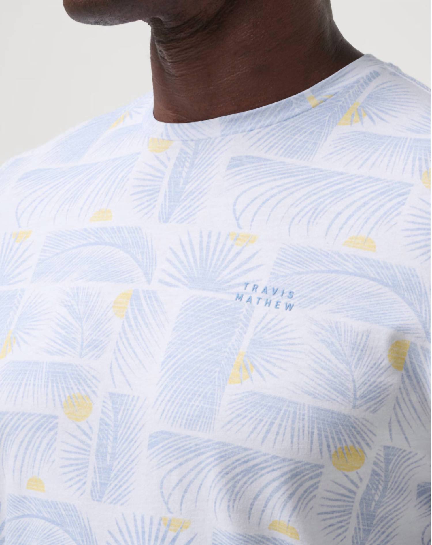 Experience the laid-back island vibes with the TravisMathew CANCEL ALL CALLS TEE. This men's short-sleeve tee features a graphic pattern with rotating palm leaves and hidden suns that promise to bring a tropical touch to your wardrobe. Material: 100% Cotton. Neckline: Crewneck. Closure Type: Pull-on. Color: White. Perfect for capturing that vacation spirit every day.