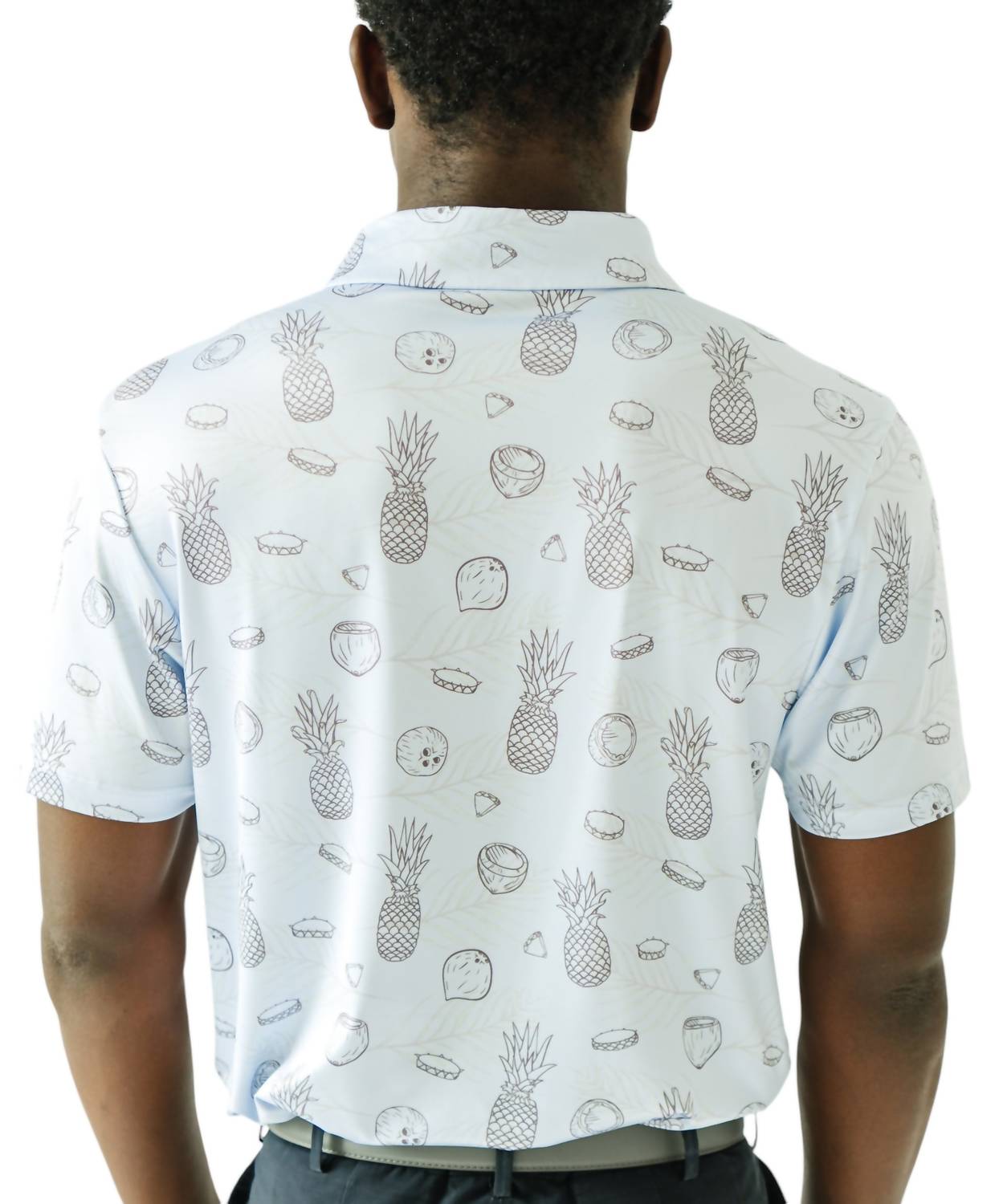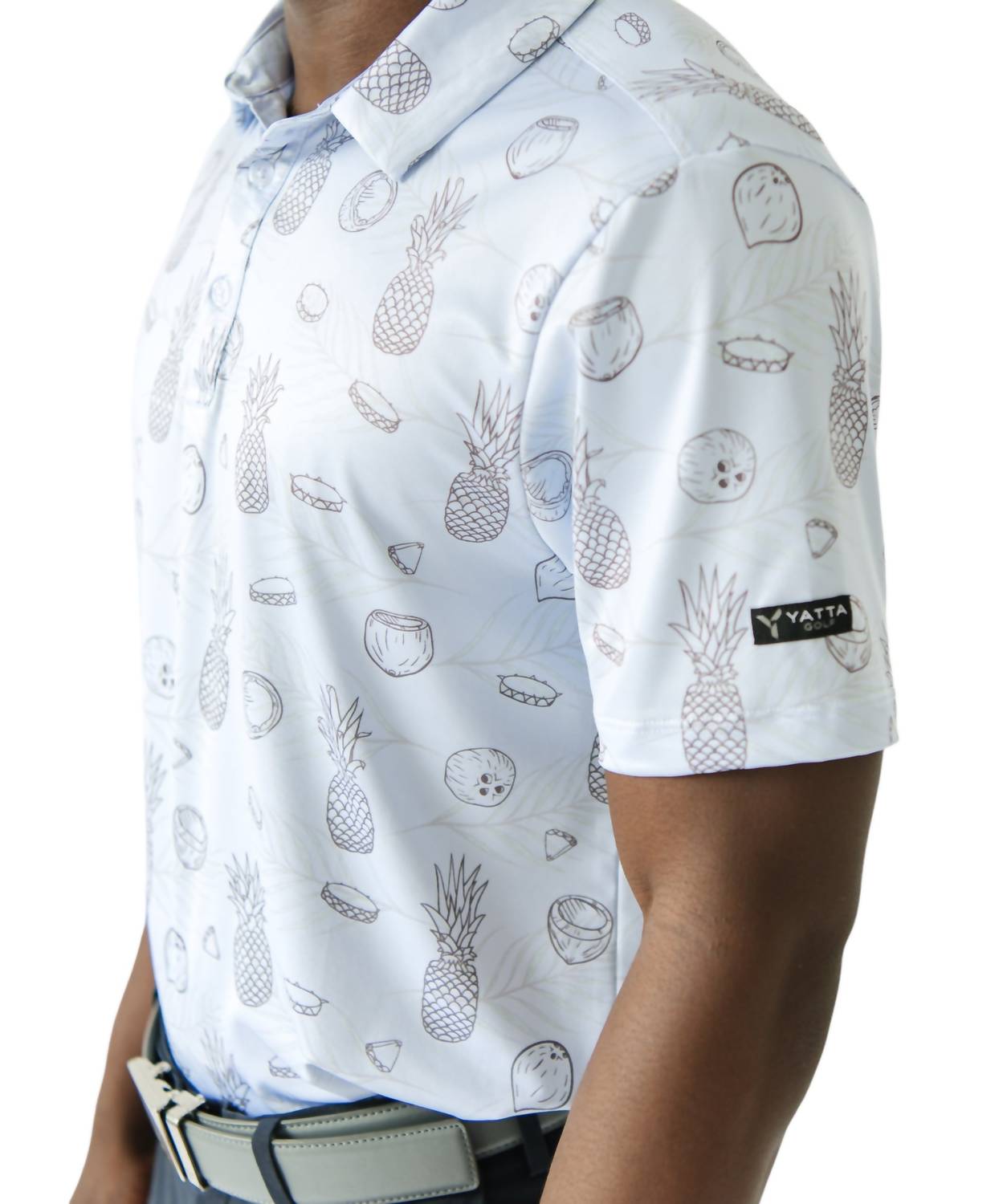Designed for an athletic fit, it features a 4-way stretch and moisture-wicking properties to keep you comfortable on the course. It is 95% polyester and 5% spandex. Machine wash cold; tumble dry low.