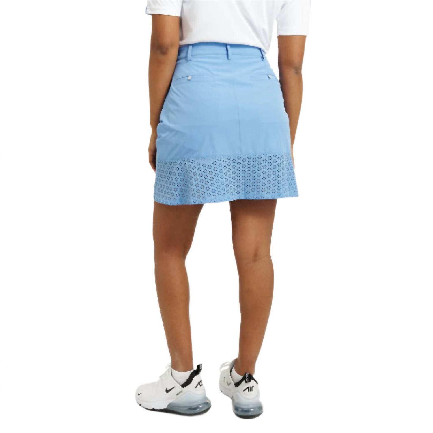 A skirt that you can do just about anything in? We love a good skort, especially this one! Introducing the Manga Golf Skorts by Abacus Sportswear US, crafted from breathable nylon in an elegant heaven hue. This women’s skort offers a sleek front with a side zipper, integrated shorts, and a stylish perforated floral pattern at the back for a lovely drape. Designed for both active pursuits and casual wear, it features practical belt loops, two side pockets, and two buttoned back pockets for all your essentials. Care instructions include machine wash and tumble dry, making it a practical addition to your athleisure game day wardrobe.
