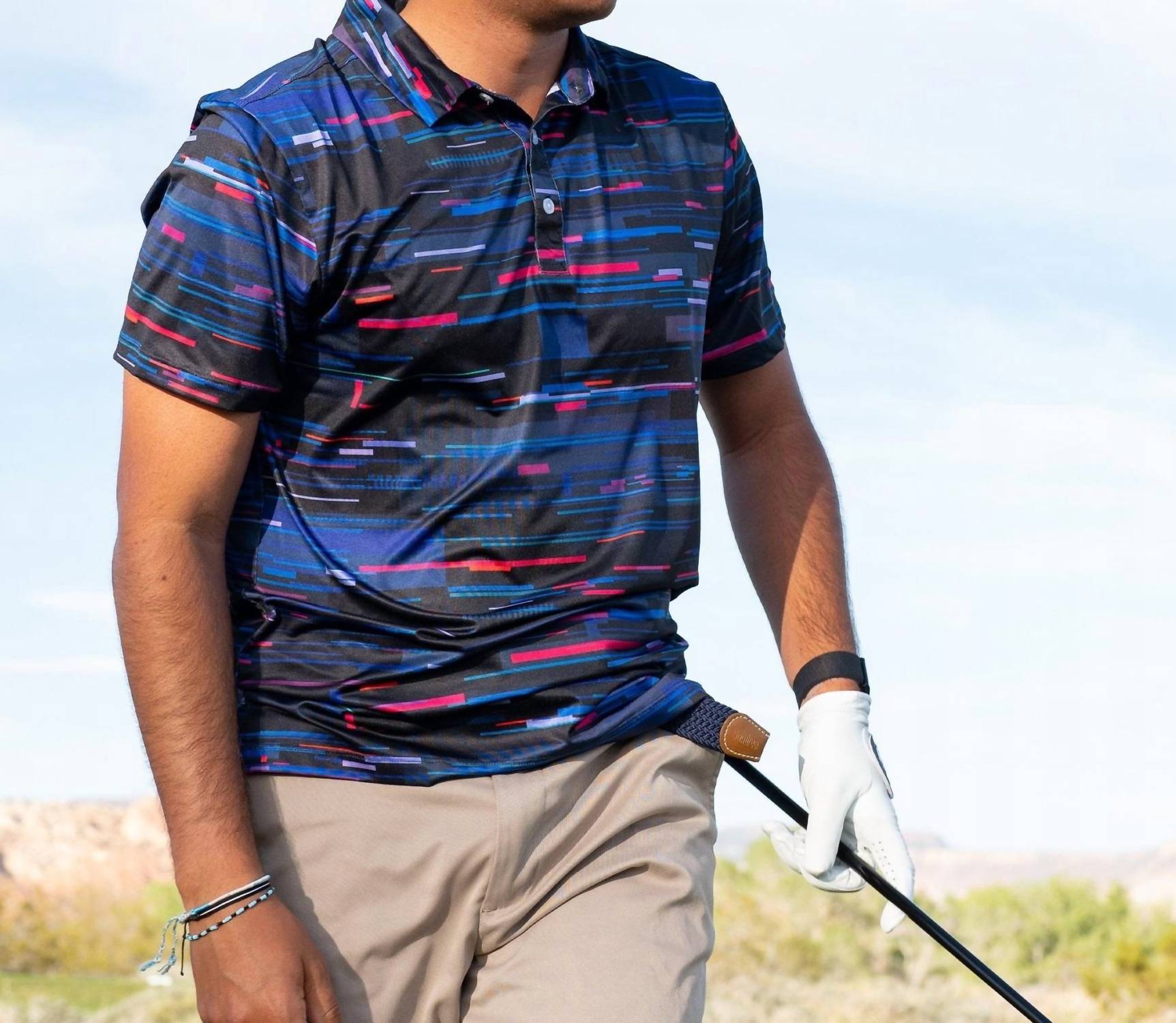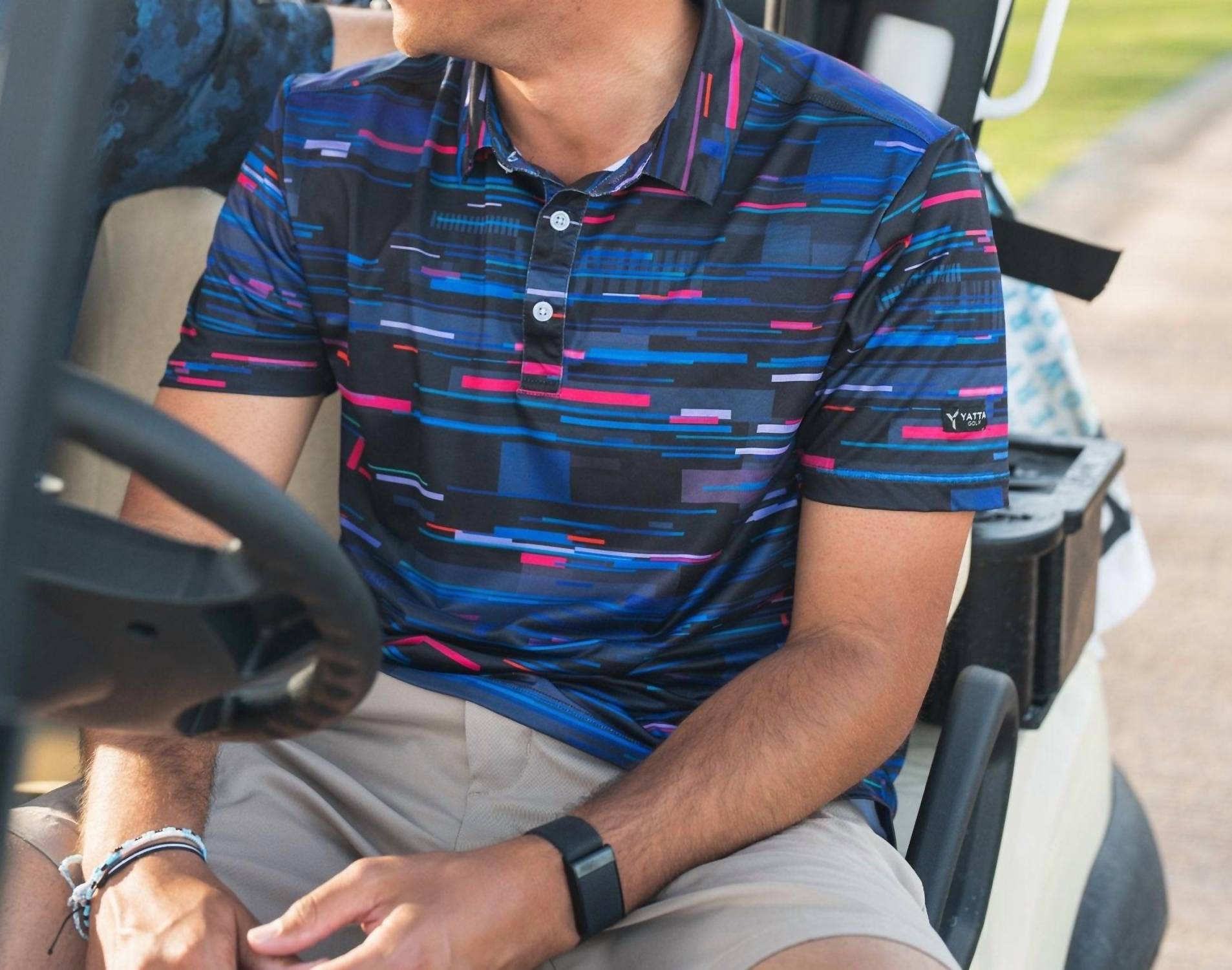 Discover the Yatta Golf Polo Shirt in the refreshing Light Wave hue, designed for optimal performance and style. This men’s polo features short sleeves and a classic collar, crafted from a resilient blend of 95% polyester and 5% spandex for 4-way stretch, moisture wicking, and wrinkle resistance. Closure is secured with a button, and it's conveniently machine washable and tumble dryable. Ideal for activewear enthusiasts, indulge in the graphic pattern that subtly elevates your golf attire.