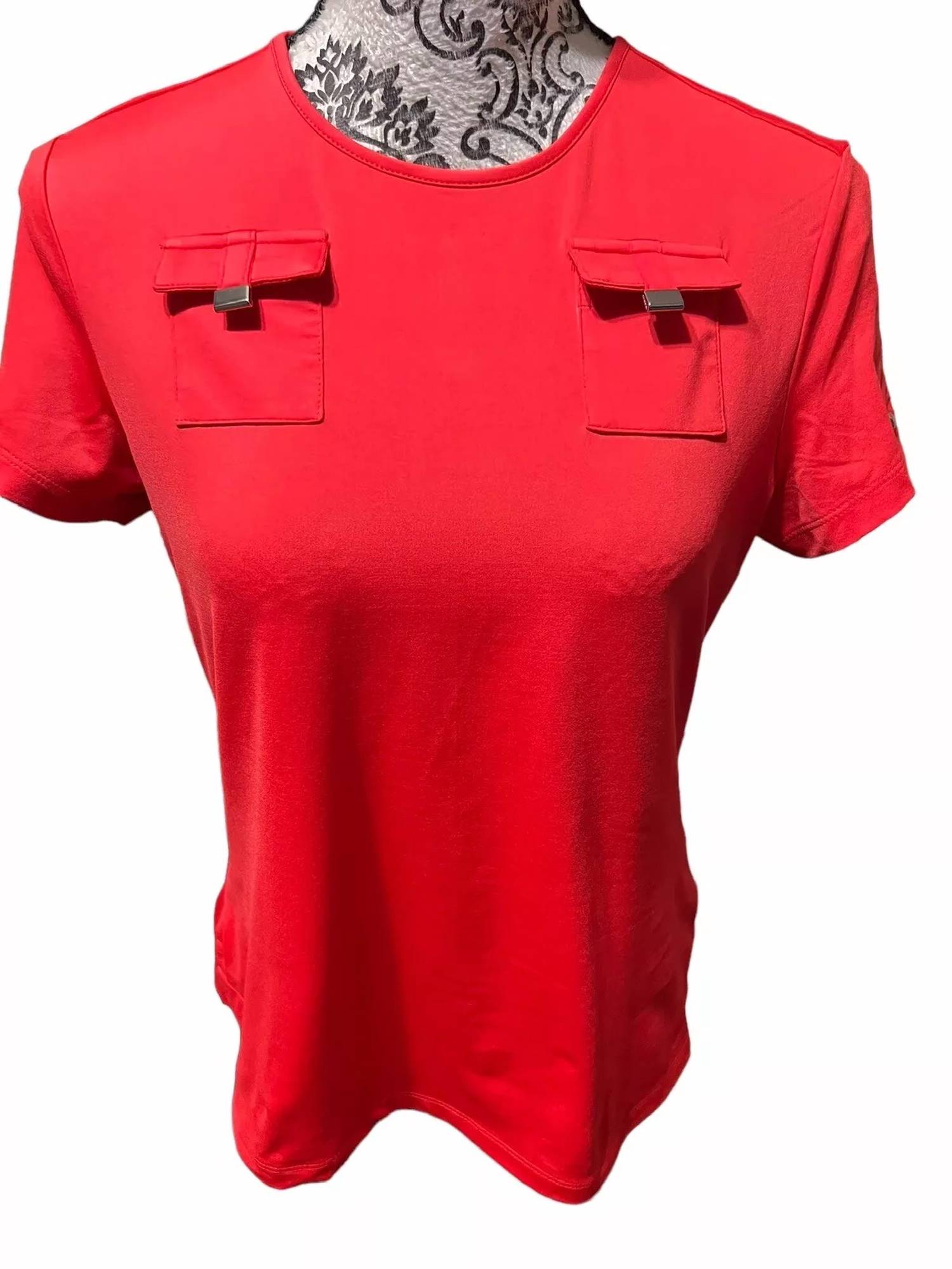 The short sleeve tee you'll want in every color. Discover the Jamie Sadock Women's Short Sleeve Golf Shirt in a vibrant Adrenaline hue, perfect for an active lifestyle. Crafted from a blend of 84% Polyester and 16% Nylon, this short sleeve tee features a solid pattern and a classic crewneck design. Country of origin: India. Closure: Pull on. This shirt includes convenient front pockets, adding functionality to its sleek design. Care instructions: Machine wash and lay flat to dry.