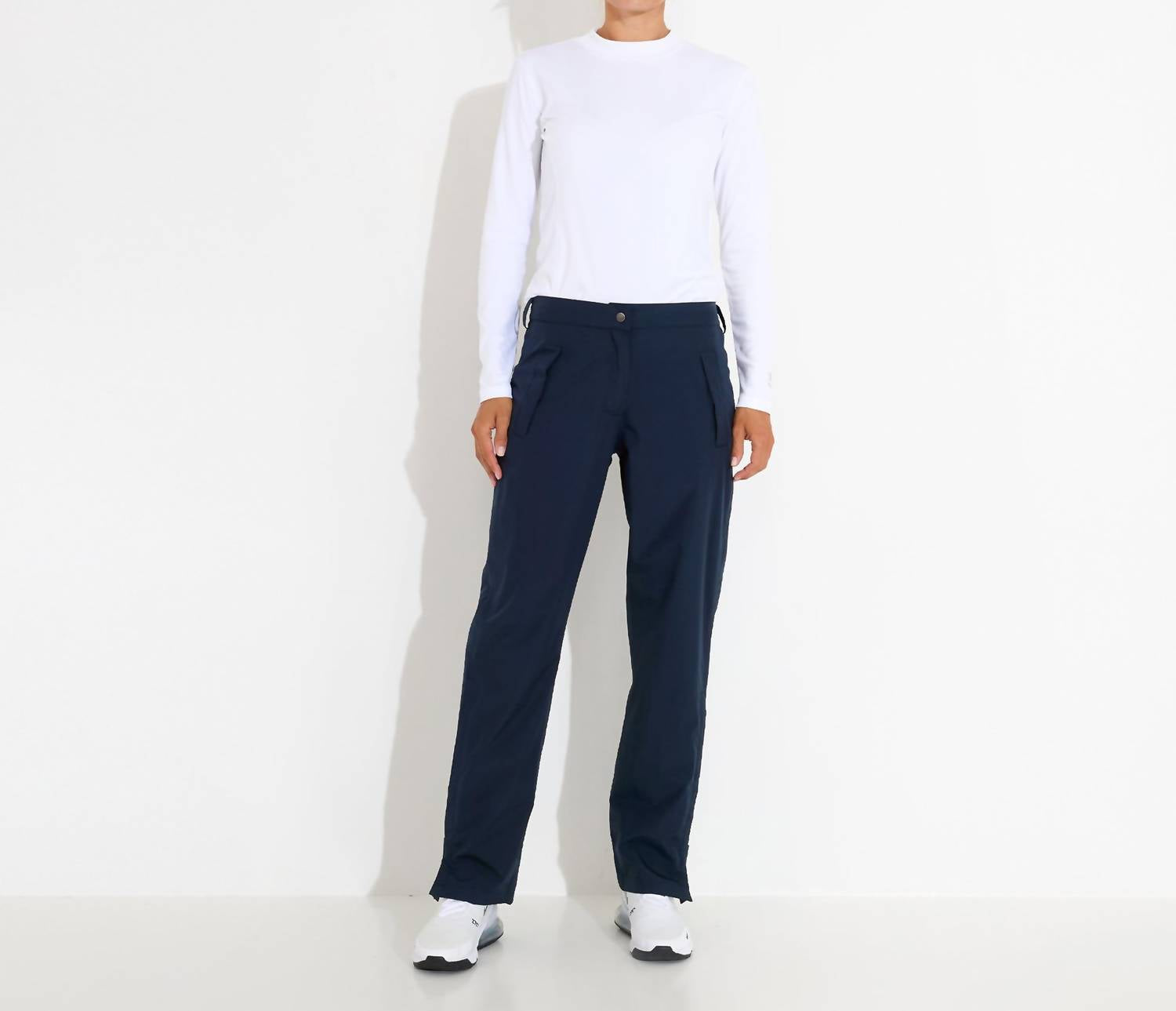Experience ultimate comfort and protection with the Links Rain Golf Trouser by Abacus Sportswear US, designed for women who embrace game day style. These trousers feature a relaxed fit and are crafted from solid navy, waterproof, two-way stretch fabric for exceptional breathability, ensuring comfort on those unpredictable spring days. Equipped with a convenient zip closure, an elastic waist at the back, and long side zippers that extend 2 inches from the hem, these trousers are made to be worn over your golf attire for quick weather protection. Care is simple with machine wash and line dry instructions, allowing you to focus on your athleisure trend on and off the course.