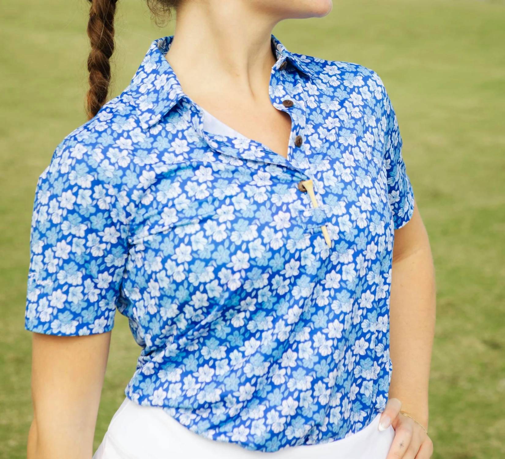 Look no further, you just found your perfect tee! Introducing the Azaleas Golf Polo Shirt by Kenny Flowers, perfect for elevating your game day wardrobe with style and comfort. This women's polo features short sleeves and a classic collared neckline, made from breathable, moisture-wicking fabric to keep you fresh on the course. The blue and white floral pattern combined with a button closure offers a polished and flattering look. Care for it with ease thanks to its machine wash and tumble dry instructions.