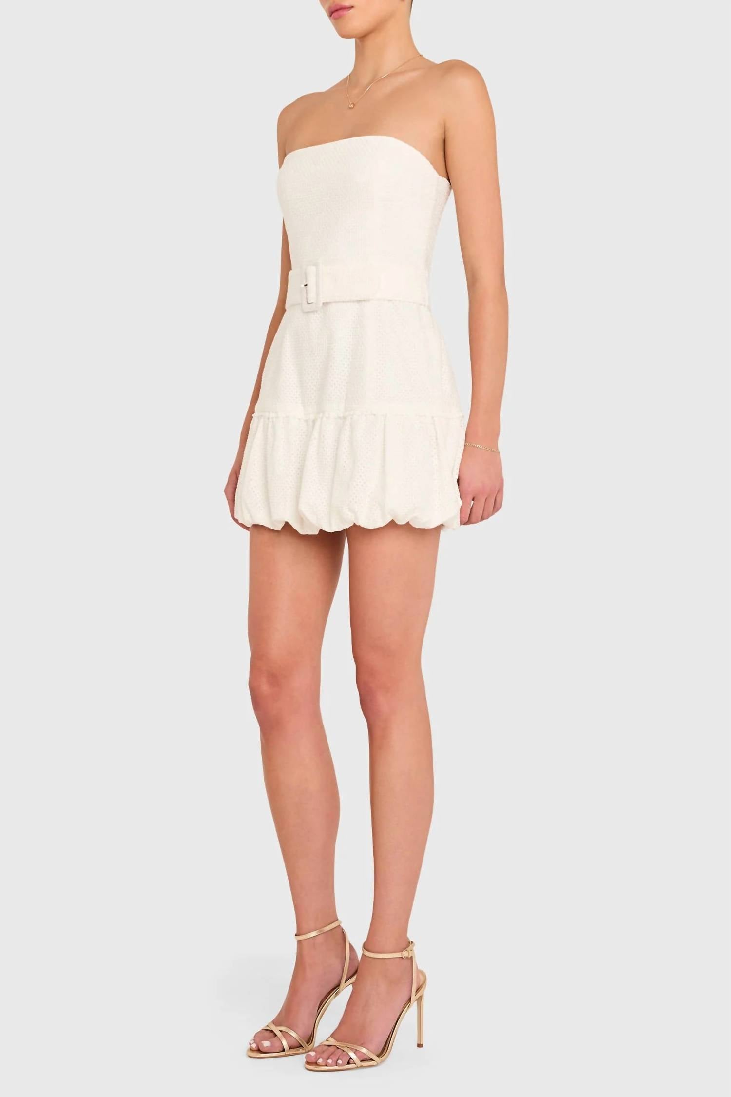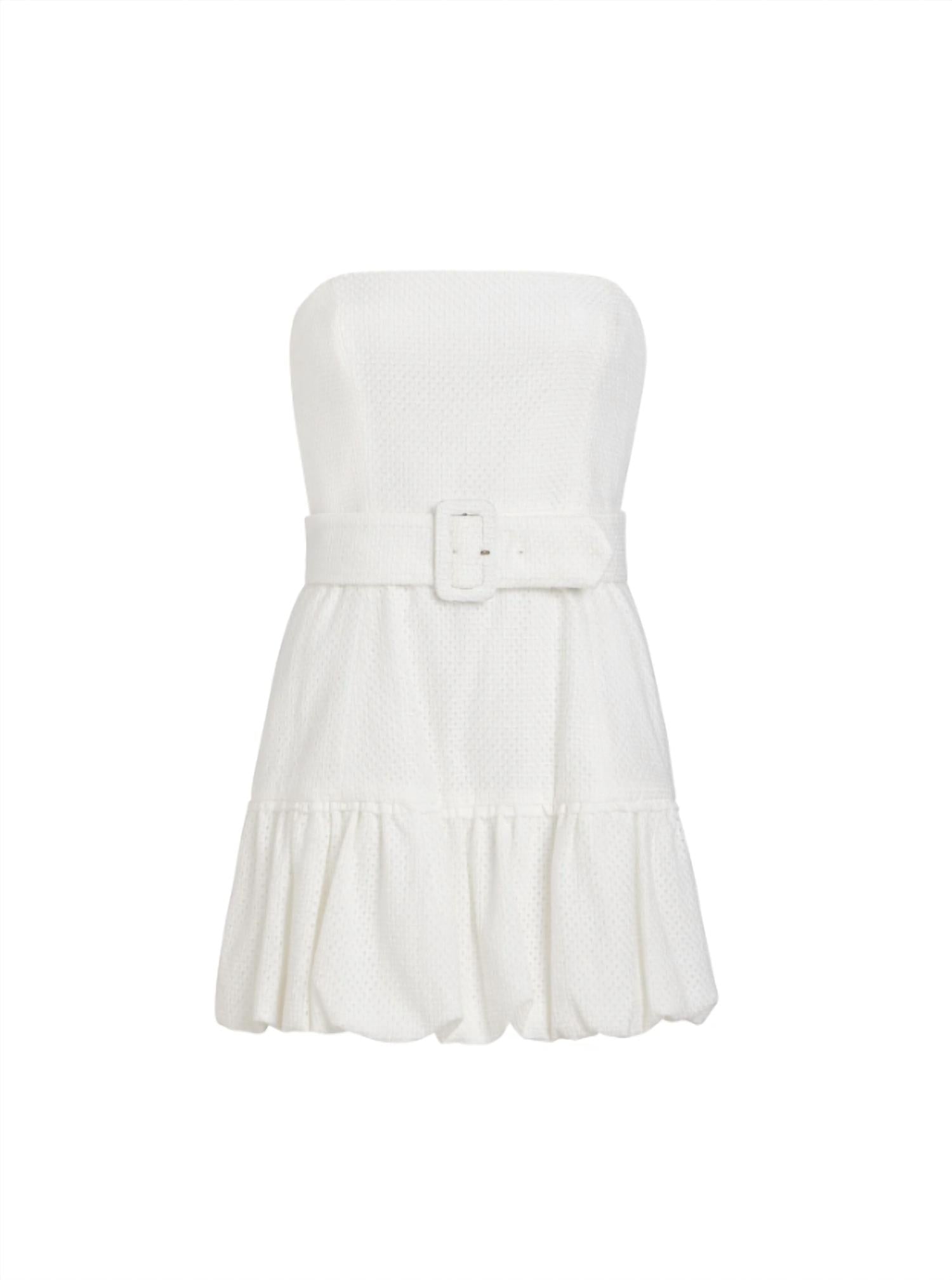 The kind of easy and flattering dress you'll be reaching for all season long. Steal the spotlight with the Amanda Uprichard Yvette Bubble Dress, a strapless white mini that exudes playfulness with its fitted bodice and bubble skirt. The off-the-shoulder design is enhanced by a ruffle trim and a self-covered buckle belt that beautifully cinches the waist. Made from 100% cotton, this dress features a lined interior and a convenient center back zip closure. Dry clean only.