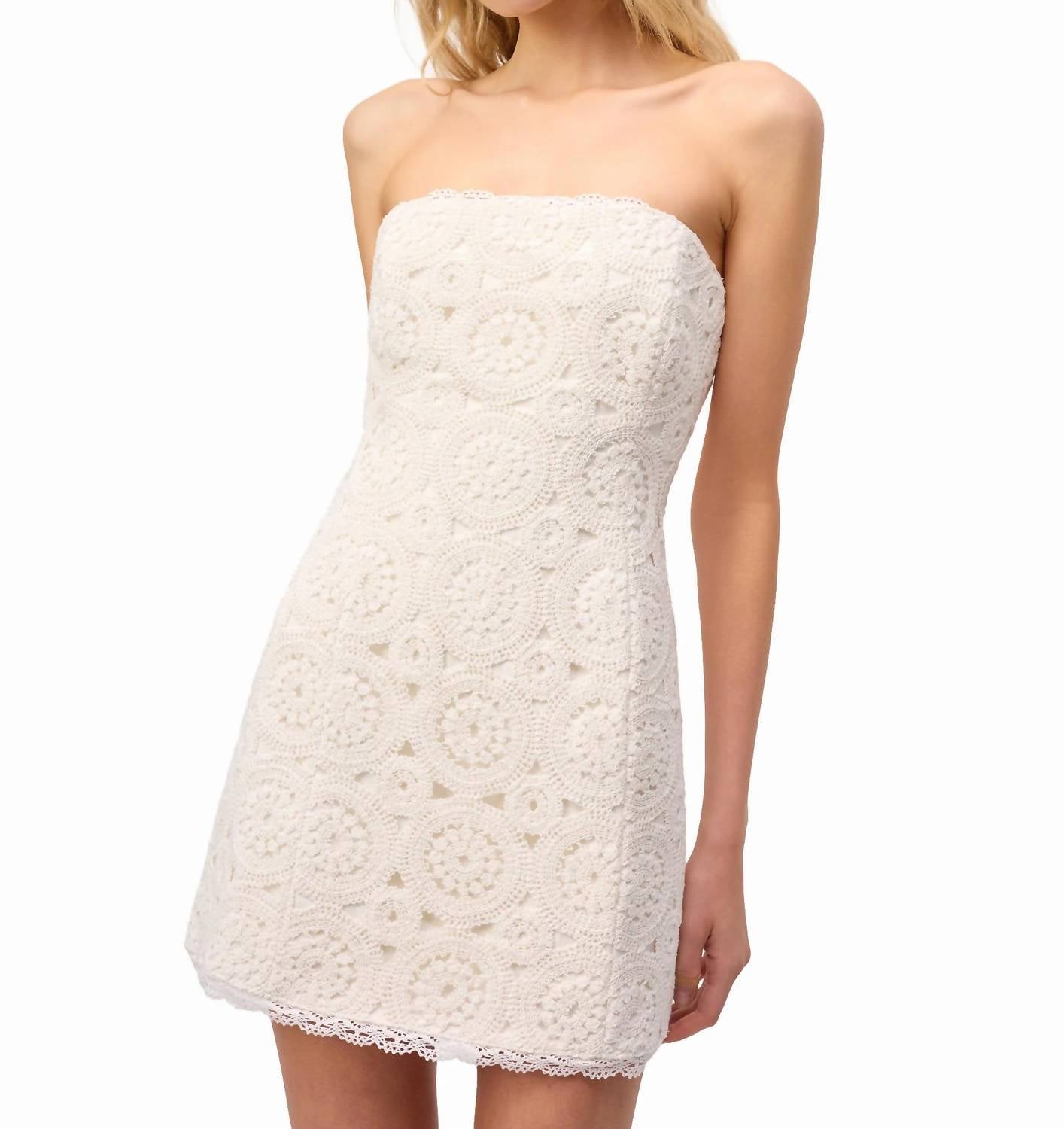 The perfect mini dress for those warmer months. The Cami NYC Crochet Mini Dress in Macadamia is your go-to piece for a sophisticated dinner party look. Designed with a strapless silhouette and off-the-shoulder neckline, it exudes quiet luxury while the textured polyester adds a touch of elegance. Crafted for women, this shift mini dress features a convenient zip closure to ensure a flattering fit. To maintain its pristine condition, dry clean only.