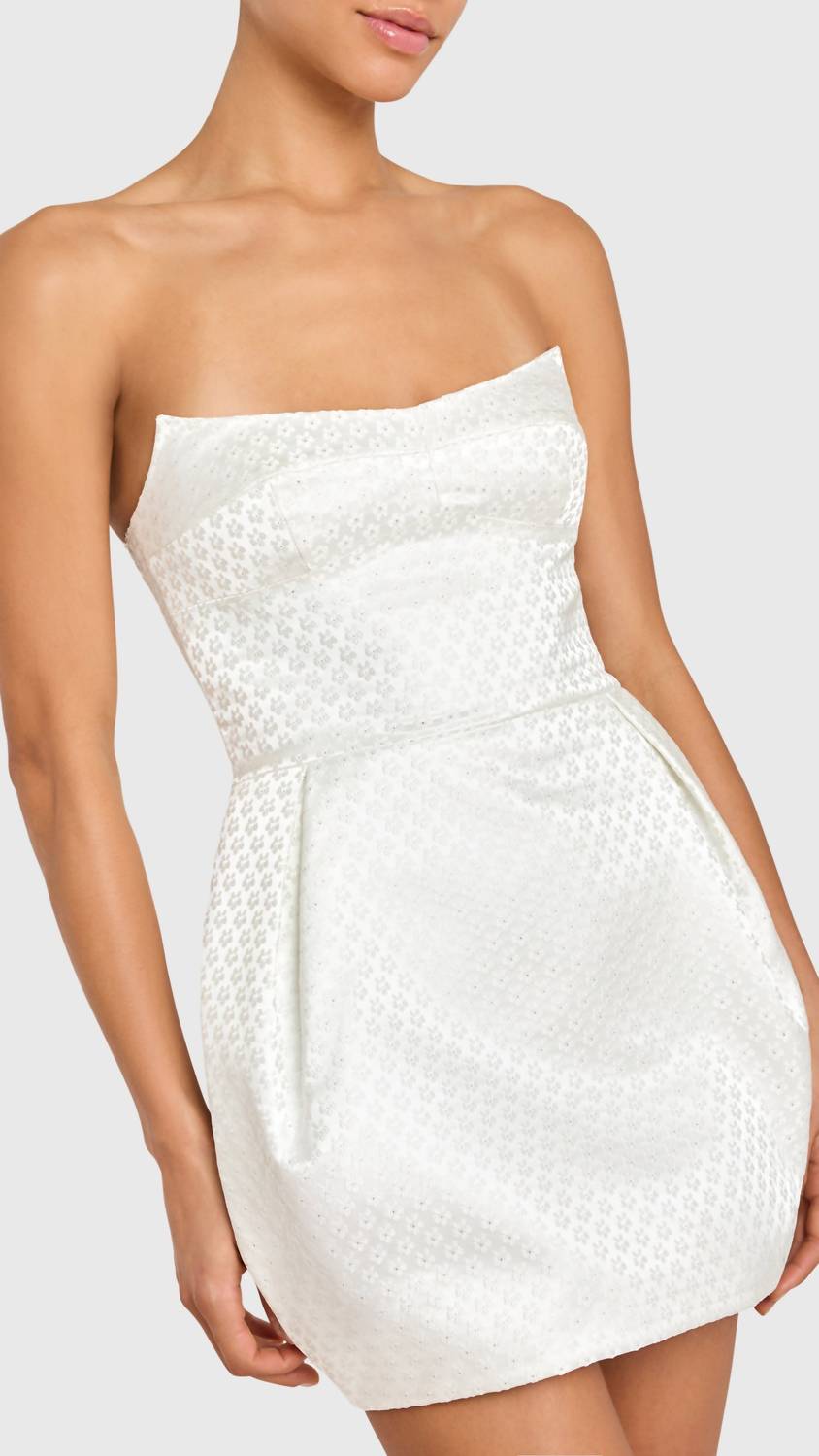 The perfect mini dress for those warmer months. Meet the Bowery Strapless Embroidered Mini Dress by Amanda Uprichard, a stunning choice for evening events. This mini dress boasts a stylish strapless sweetheart neckline and textured satin jacquard fabric, featuring a corset with shaped cup detail and a structured mini skirt. Crafted from 95% Polyester and 5% Lurex, it offers a luxurious touch with front and back pleats for added volume. The dress is fully lined and designed with a convenient zip closure at the back. Care: Dry clean only.