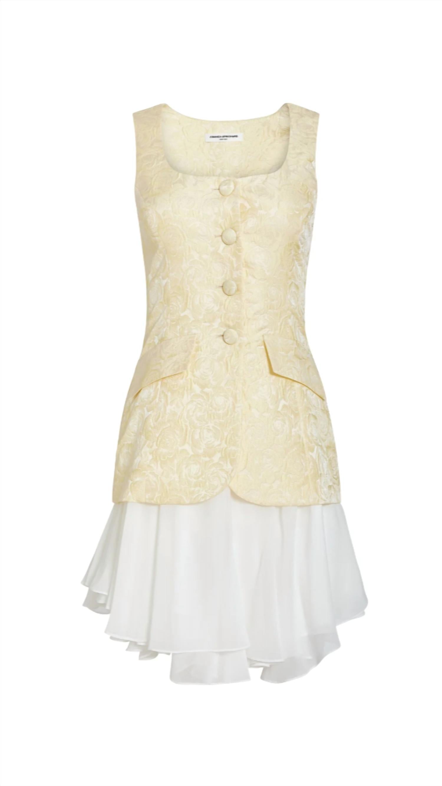 The perfect mini dress for those warmer months. Elevate your spring wardrobe with the Lilibet Sleeveless Mini Dress by Amanda Uprichard, a solid white and cornsilk piece perfect for any engagement. Designed with a scoop neck and structured bodice overlay, this dress features a gathered ruffle skirt and faux flap pockets. Composition includes 100% polyester, with lining made of 95% polyester and 5% elastane, and a pull-on style complemented by self-covered buttons and an invisible zipper on the left side seam. With a garment length of 33 inches, this fit-and-flare silhouette should be dry cleaned only. Modeled in size small (5' 7.5" height, 34.5" bust, 29" waist, 38" hips).