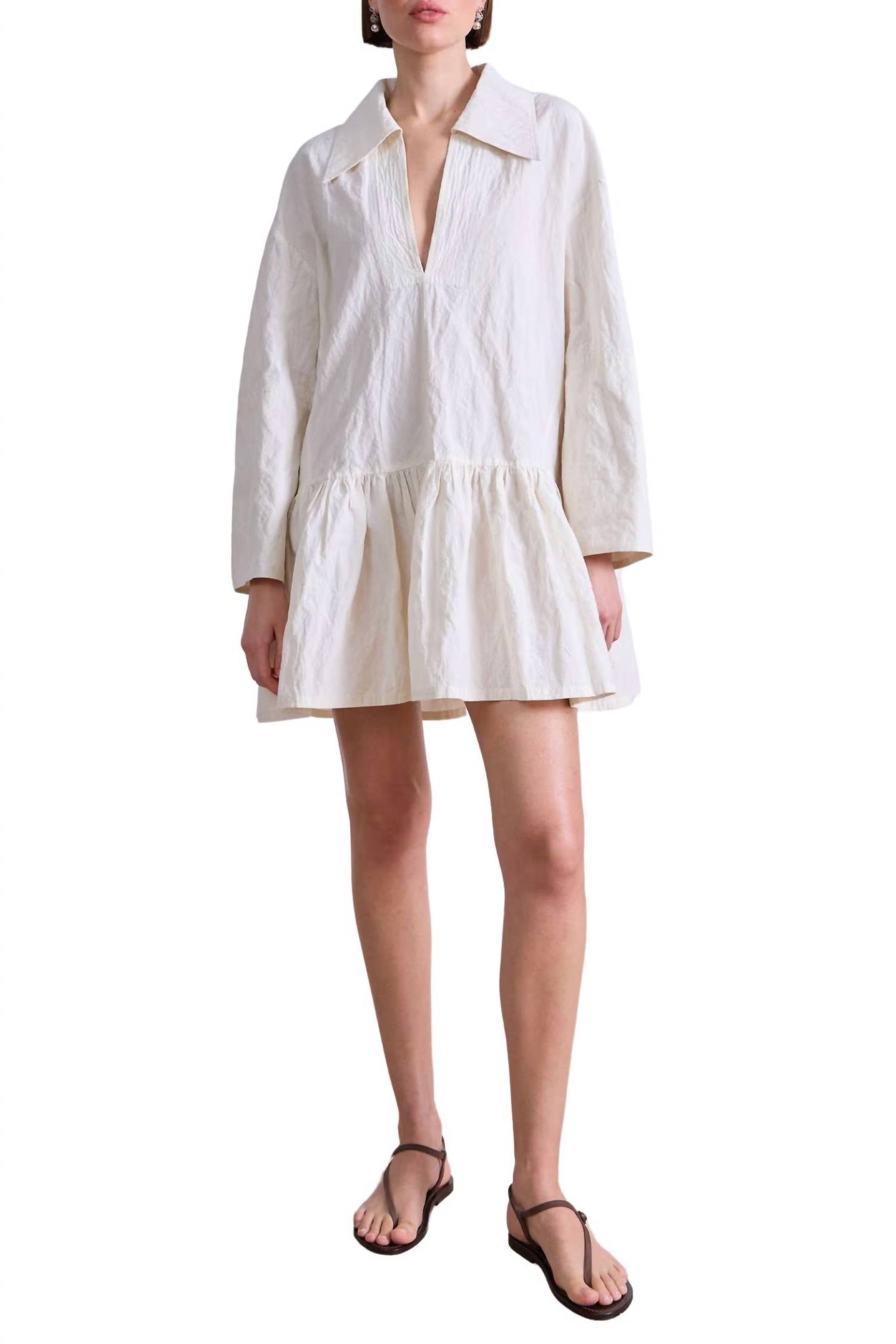 A short and breezy dress for those warmer days. Embrace timeless style with the Romana Mini Dress by APIECE APART in a chic cream hue. This feminine piece boasts long sleeves, a relaxed loose silhouette, a drop waist, and a V-neckline with a shirt collar and deep slit, perfect for a dinner party. Its luxurious composition of 57% Cotton, 36% Viscose, and 7% Metallic fabric, crafted in China with imported Italian material, ensures quality and comfort. Designed with a pull-on closure for ease, this dress is best maintained through dry cleaning.