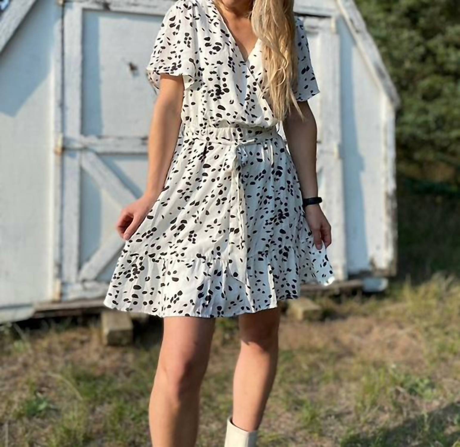 The perfect mini dress for those warmer months. Introducing the Flutter Sleeve Printed Dress by SHE + SKY, a stylish mini dress in an off-white hue. This piece boasts short flutter sleeves and a flattering animal print, with a self-tie waist sash for added definition. Made from 100% polyester and fully lined for comfort, it features a pull-on closure and a v-neckline for easy wear. Care for this dress is a breeze with machine wash instructions.