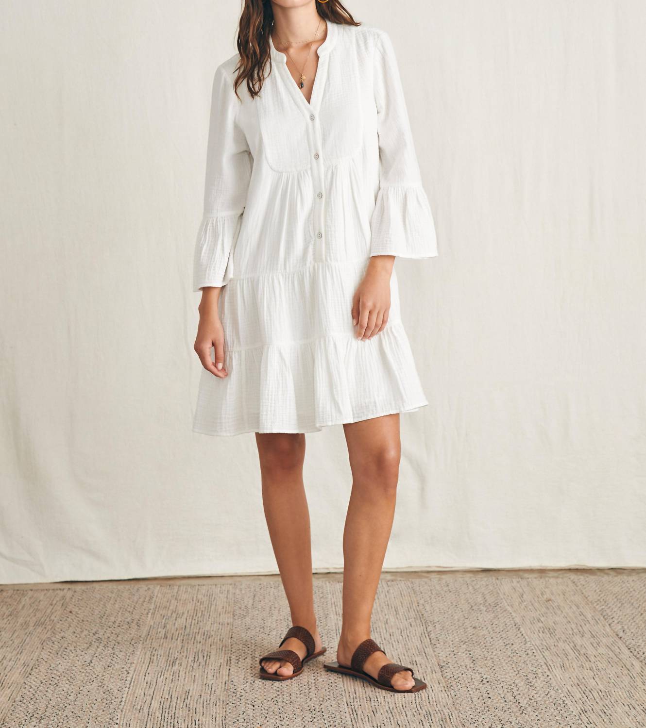 A short and breezy dress for those warmer days. The Dune Cotton Mini Dress by Faherty embodies effortless style with its tiered mini skirt and long, billowy sleeves. Crafted from 100% organic cotton, this white dress offers a relaxed and breathable fit, perfect for summer vacations and Thanksgiving gatherings. This minimalist shift dress features a V-neck and button closure, offering a versatile look that transitions seamlessly from errands to dinner outings. Care instructions suggest a machine wash on a delicate cycle and a cool tumble dry; cool ironing if needed. The dress measures 36" in length and is devoid of pockets for a sleek silhouette.