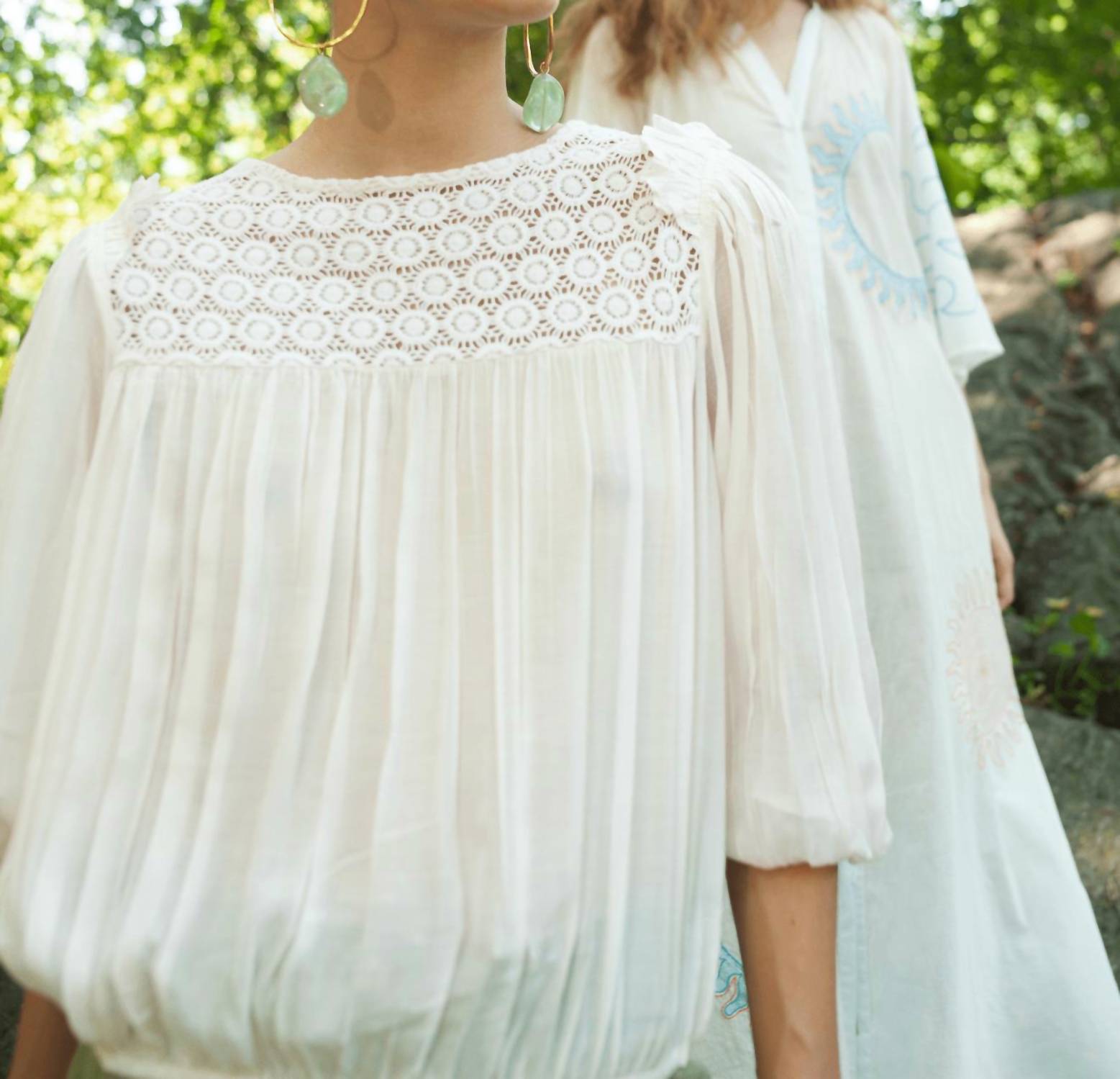 A versatile blouse that works from desk to dinner! Introducing the Ulla Blouse by Guadalupe Design, a beautifully beige piece perfect for various occasions like Thanksgiving or housewarming gatherings. Featuring textured three-quarter sleeves, a stylish boatneck, and delicate lace strips for added charm. Made from 100% Viscose, it includes an undergarment camisole and secures with a back neck button closure. Care instructions: Machine wash cold, tumble dry low, steam iron; dark colors should be washed separately.