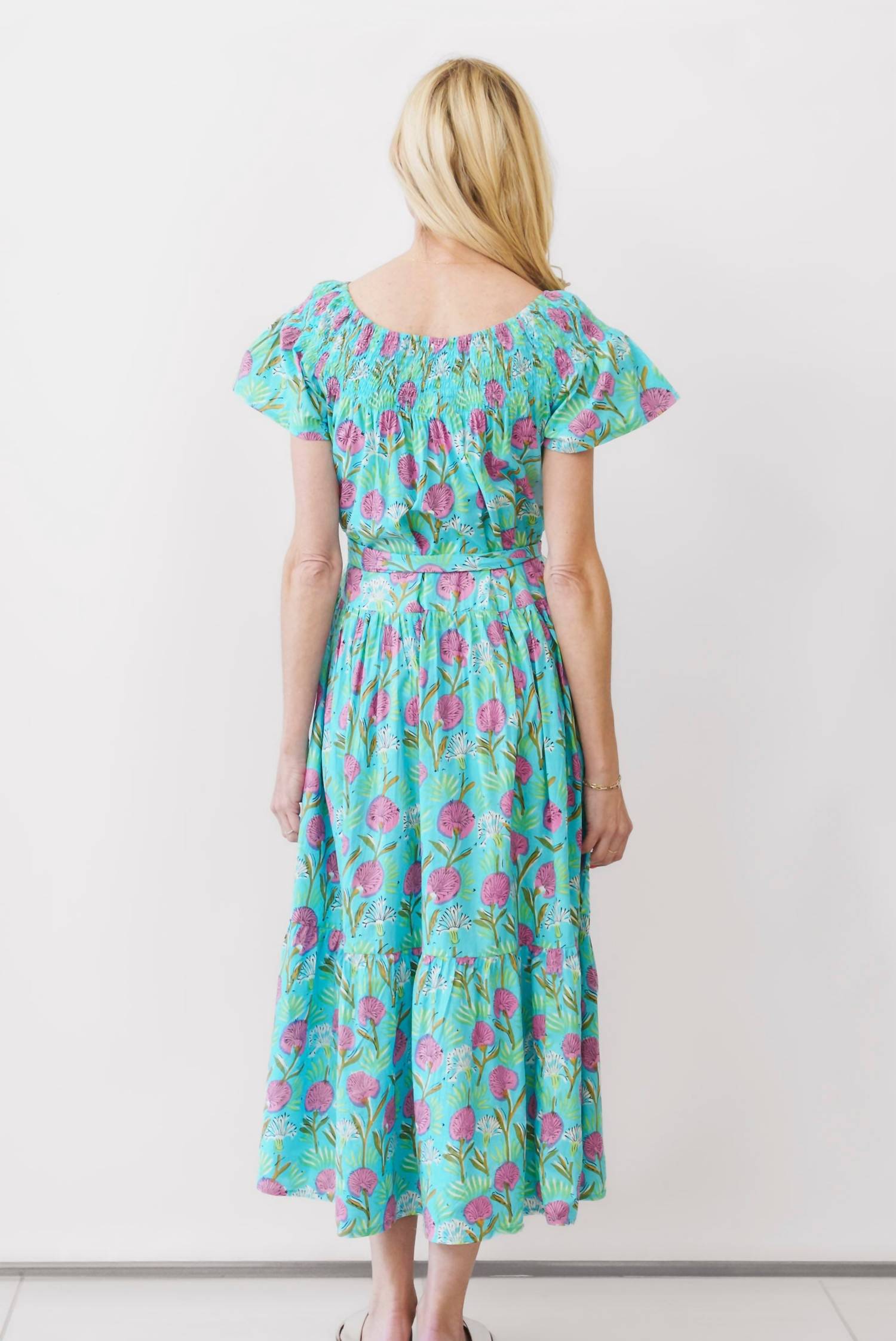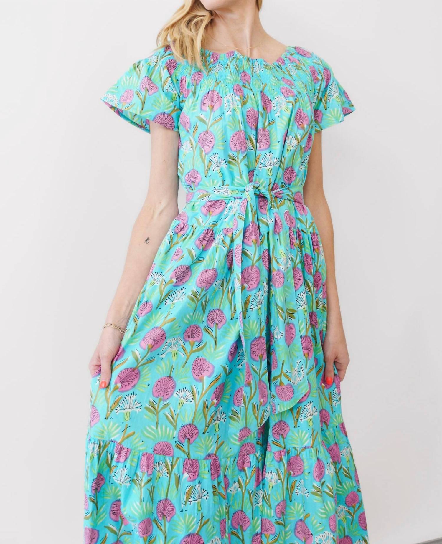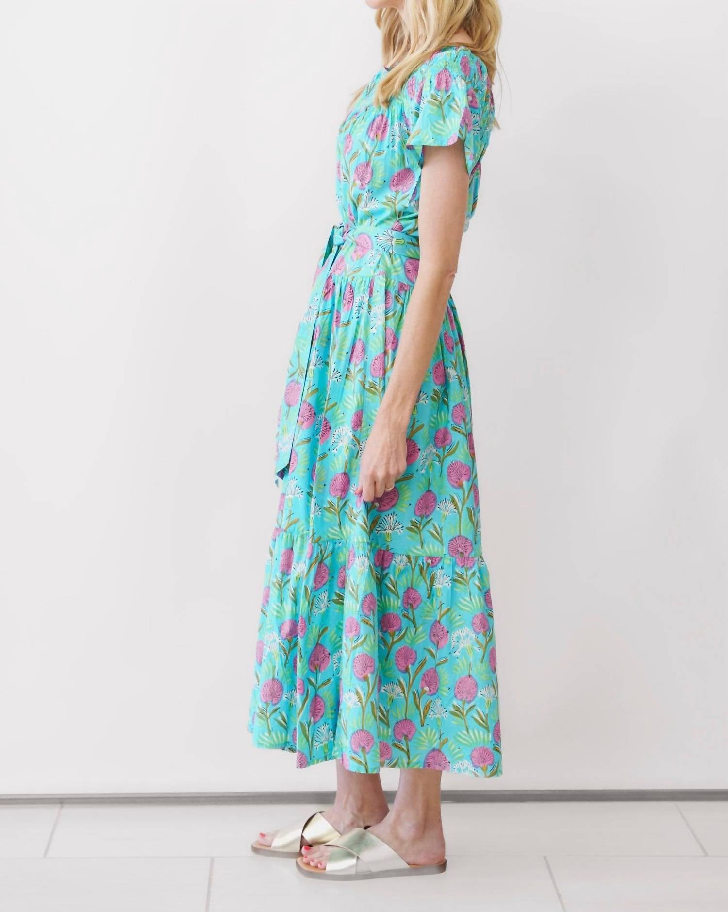 A midi dress so versatile, your options for wearing it are endless. Introducing the Momposina Camila Dress by Guadalupe Design, an exquisite piece that embodies summer elegance in a vibrant Camila Turquoise hue. This elegant midi dress features a floral pattern, short sleeves, and a comfortable V-neckline, capturing a perfect shift silhouette for a breezy vacation look. Crafted from 100% Cotton, it features a tie closure for secure wear. Ideal for maximalist style enthusiasts, this dress speaks to those looking for effortless sophistication.