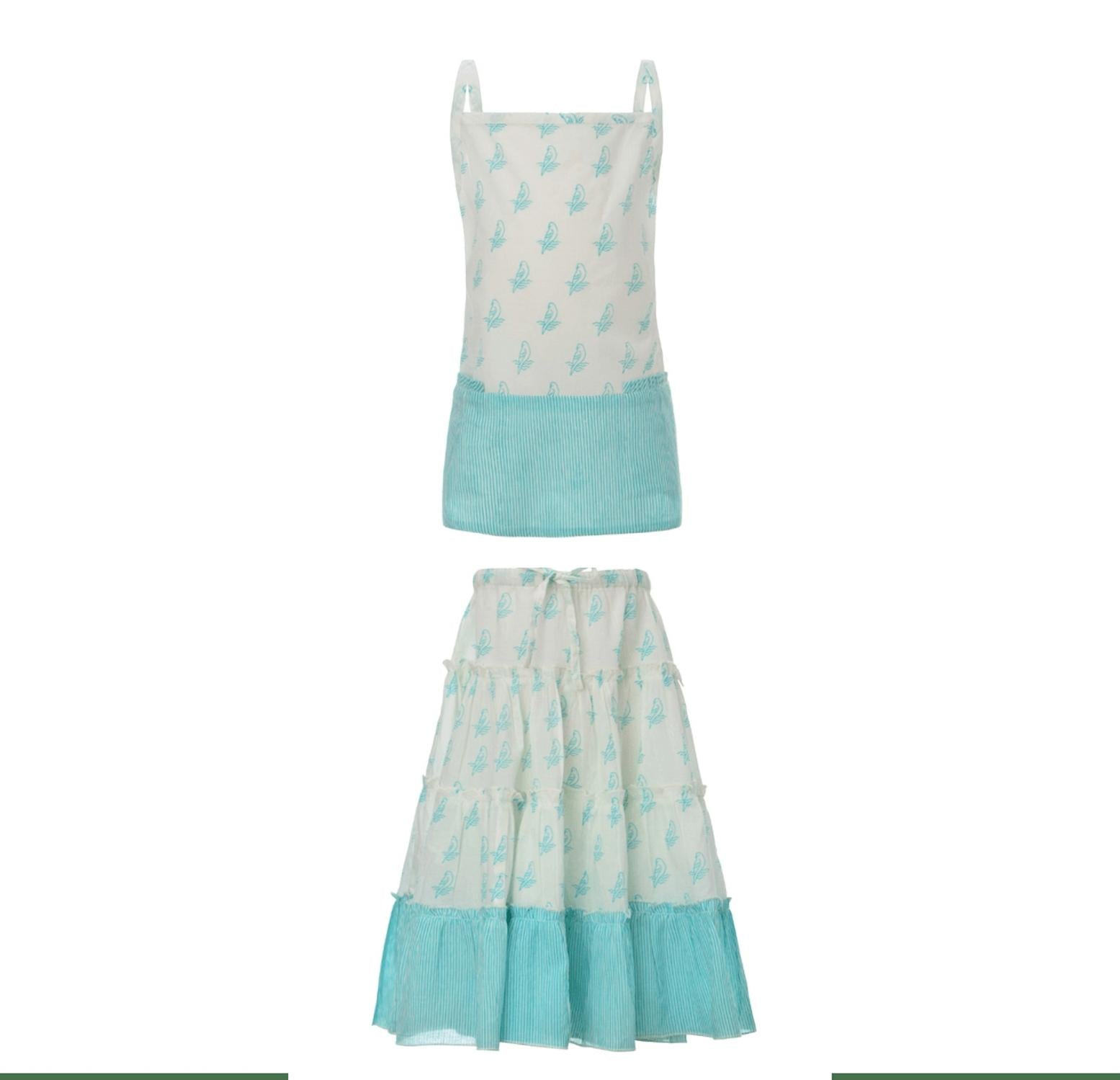 Elevate your summer wardrobe with the Mia Parrot Set by Guadalupe Design, featuring a delightful turquoise hue and playful parrot prints. The camisole cotton top boasts a charming bow closure, providing a touch of elegance and ease. Accompanied by a pleated cotton skirt, the set includes a tiered design with lining for added comfort. Care for this vibrant ensemble is straightforward with machine wash cold, tumble dry low, and the option of steam ironing or dry cleaning.