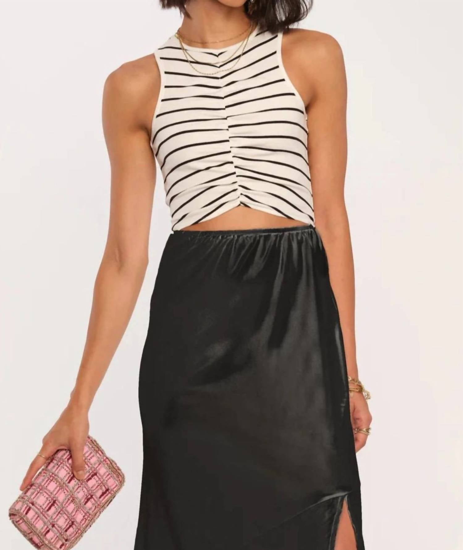 Style this maxi with your favorite statement necklace and sandals for the perfect look. Introducing the Two Piece Dress by Heartloom, designed for effortless summer elegance in timeless black and white stripes. This ensemble features a ruched mock top magically connected to a flowy maxi skirt, complete with an elastic waistband and a side slit for added style and comfort. This dress brings the illusion of two harmonious pieces to your wardrobe.