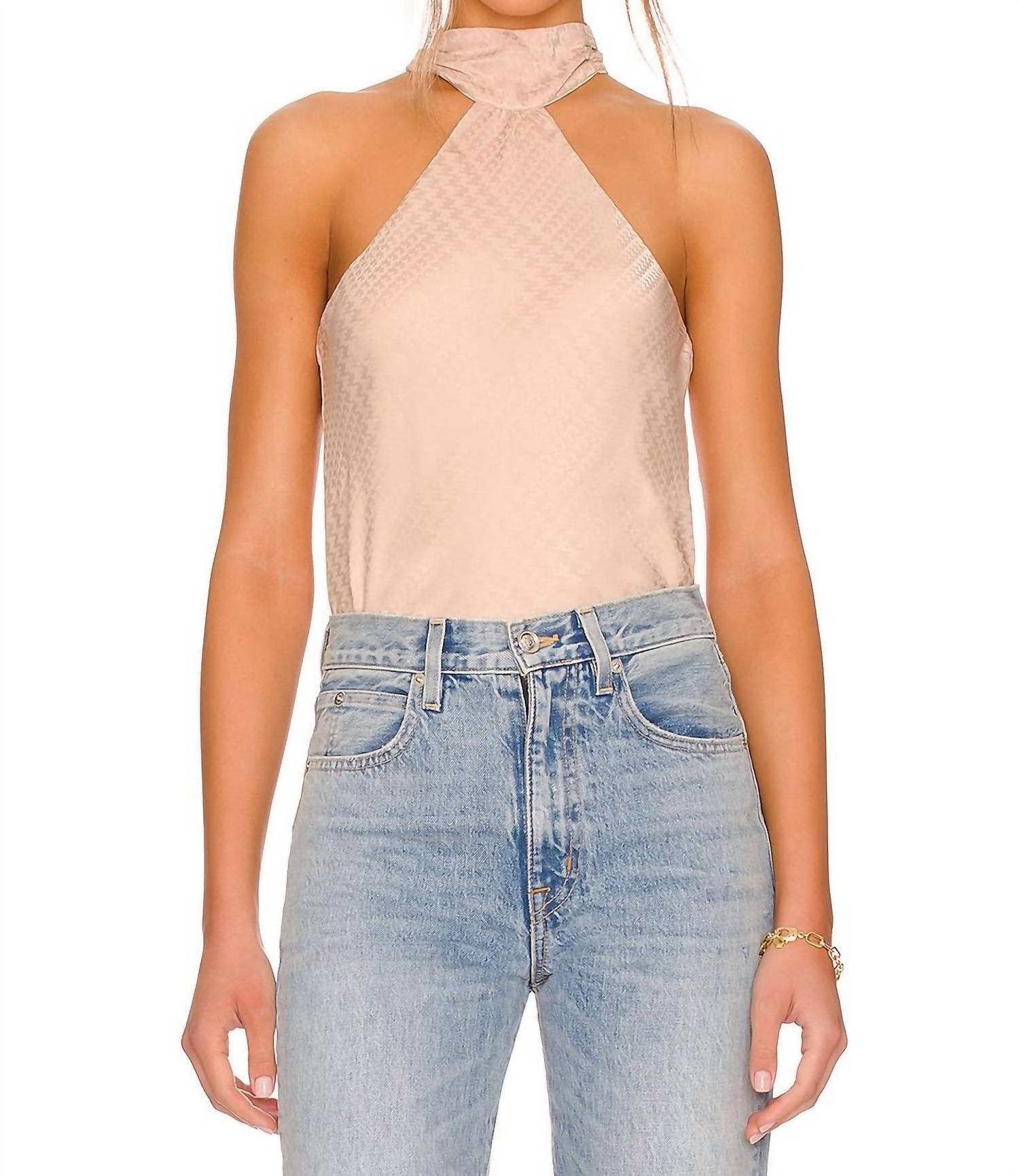 The perfect tank top for those warmer weather seasons. Features a halter neckline with a button loop closure and a back keyhole design. It is made from 97% polyester and 3% spandex, with a lining of 100% polyester. For care, hand wash only.