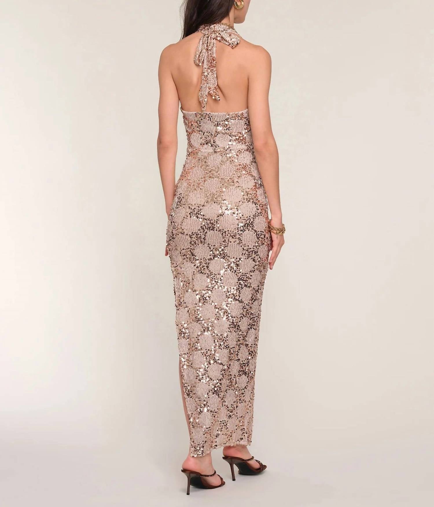 Who doesn't love a good maxi dress? This one you'll be reaching for season after season. Introducing the Acadia Dress by Heartloom, a stunning maxi perfect for holiday celebrations. This champagne dress boasts a sleeveless design with a sophisticated cowl neck. Crafted from 95% Polyester and 5% Spandex, it offers a slim shift silhouette with a patterned sequin finish. The dress features a zip closure and measures 57 inches from the high point of the shoulder.