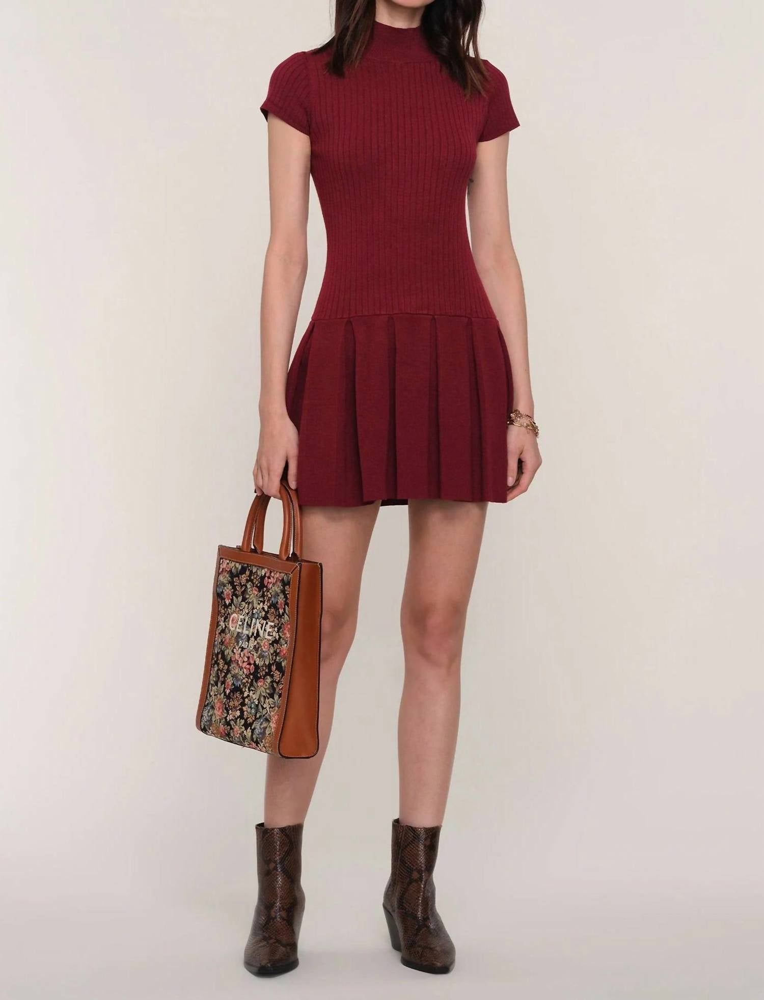 A short and breezy dress for those warmer days. Introducing the Polina Dress by Heartloom, an elegant option in a rich merlot color that exudes minimalist charm. This women's mini dress showcases short sleeves and a sophisticated mock neck, crafted from a comfortable viscose blend of 64% Viscose, 18% Polyester, and 18% Nylon. Designed with a flattering fit-and-flare silhouette and a pleated skirt, this imported piece is perfect for a cocktail party. Closure: Pull-on style. Care instructions: Hand wash and line dry. Model is wearing size X-Small.