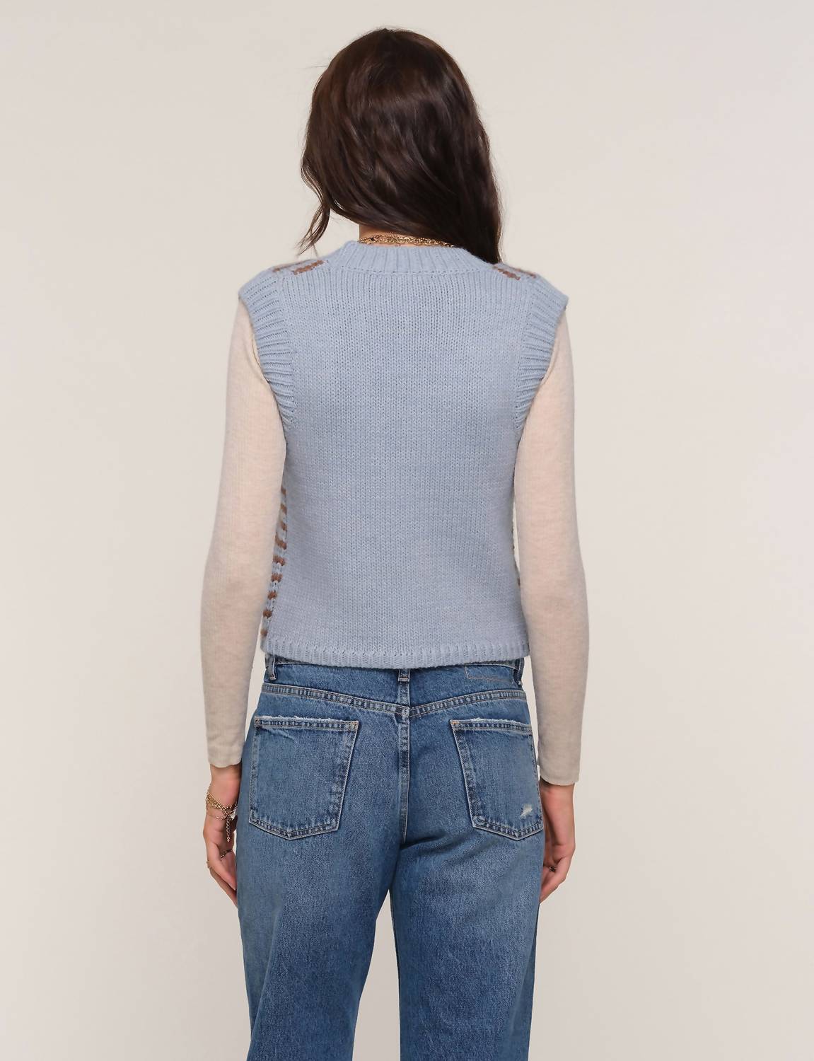 That extra layering piece you didn't know you needed! Introducing the Striped Knit Asher Vest by Heartloom, a chic addition to your spring wardrobe in a stylish blue hue. This vest showcases long sleeves and a V-neck, crafted from a striped knit with contrast rib trim for a touch of elegance. Thoughtfully designed with novelty buttons and equipped with pockets, it combines functionality and style. Closure: Button closure. Care instructions: Hand wash and line dry. Perfect for a holiday party or a preppy Thanksgiving celebration.