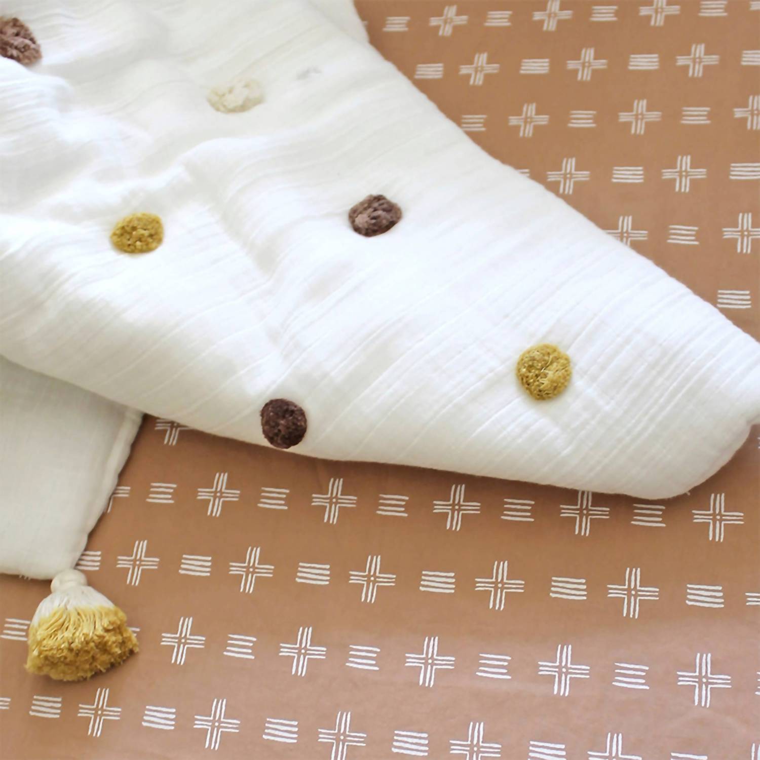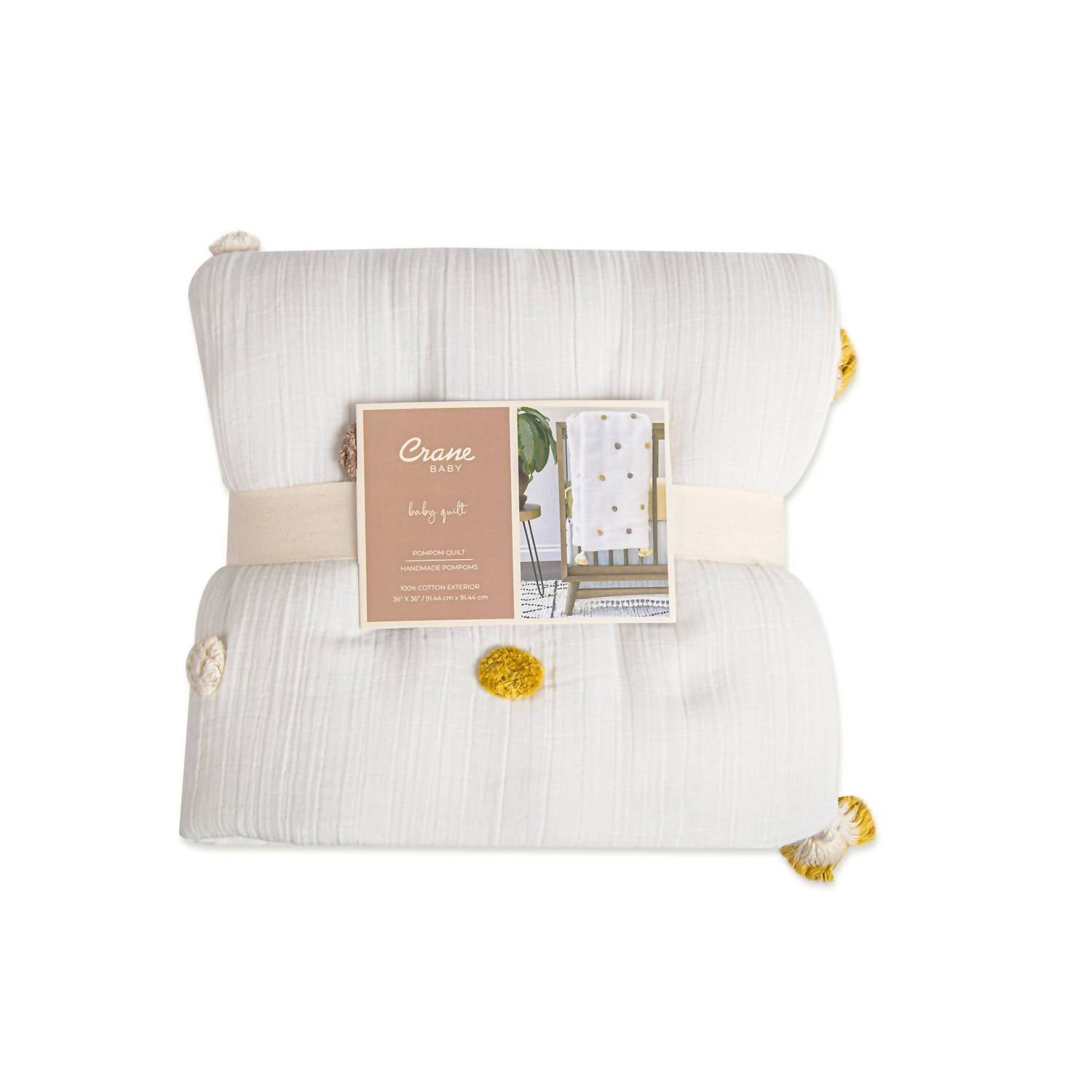 Introducing the Kendi Pom Pom Blanket by Crane Baby, a charming addition to any nursery with its delightful polka dot pattern formed by handmade pom poms. Crafted from 100% cotton, this baby quilt is incredibly soft and perfect for draping over a chair or using as a playmat for tummy time. In a versatile white color, it seamlessly complements your existing decor or pairs beautifully with Crane Baby crib sheets, swaddle wraps, blankets, and bed skirts. Please note that specific care instructions are not provided, so follow general guidelines for cotton fabric care.