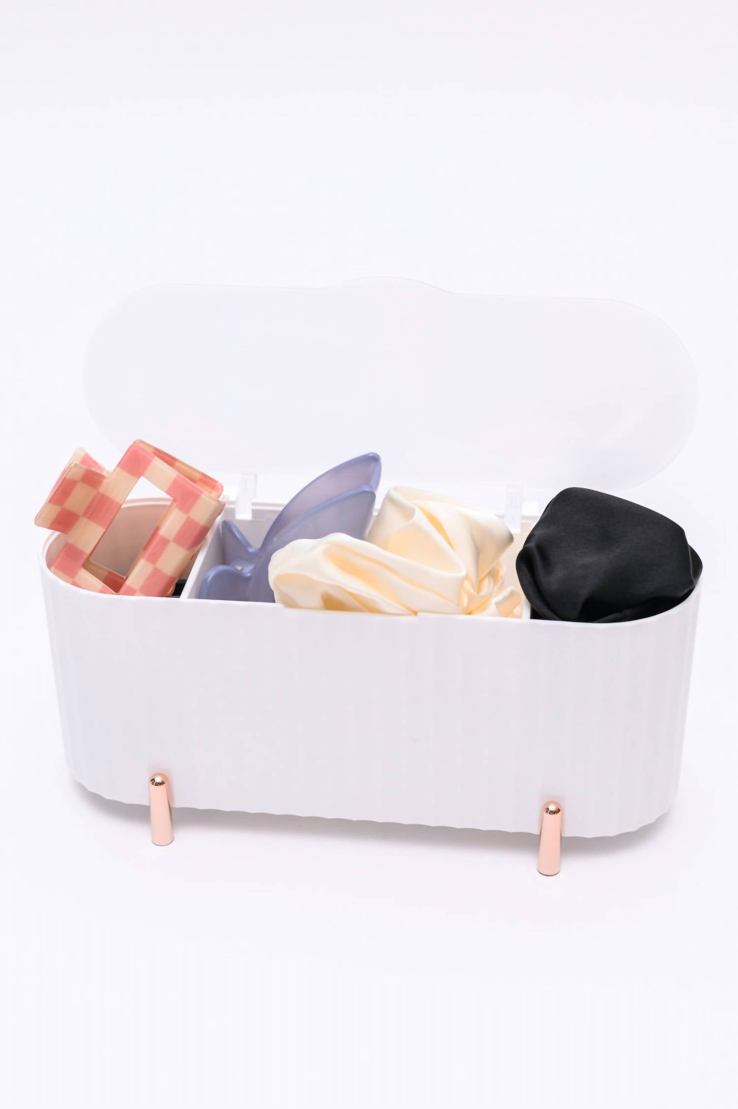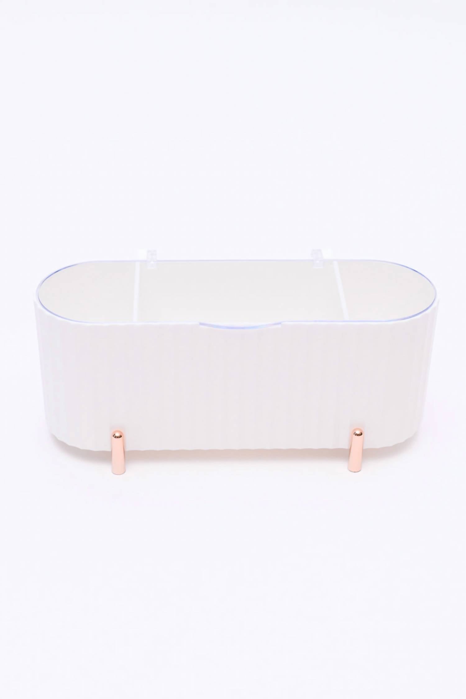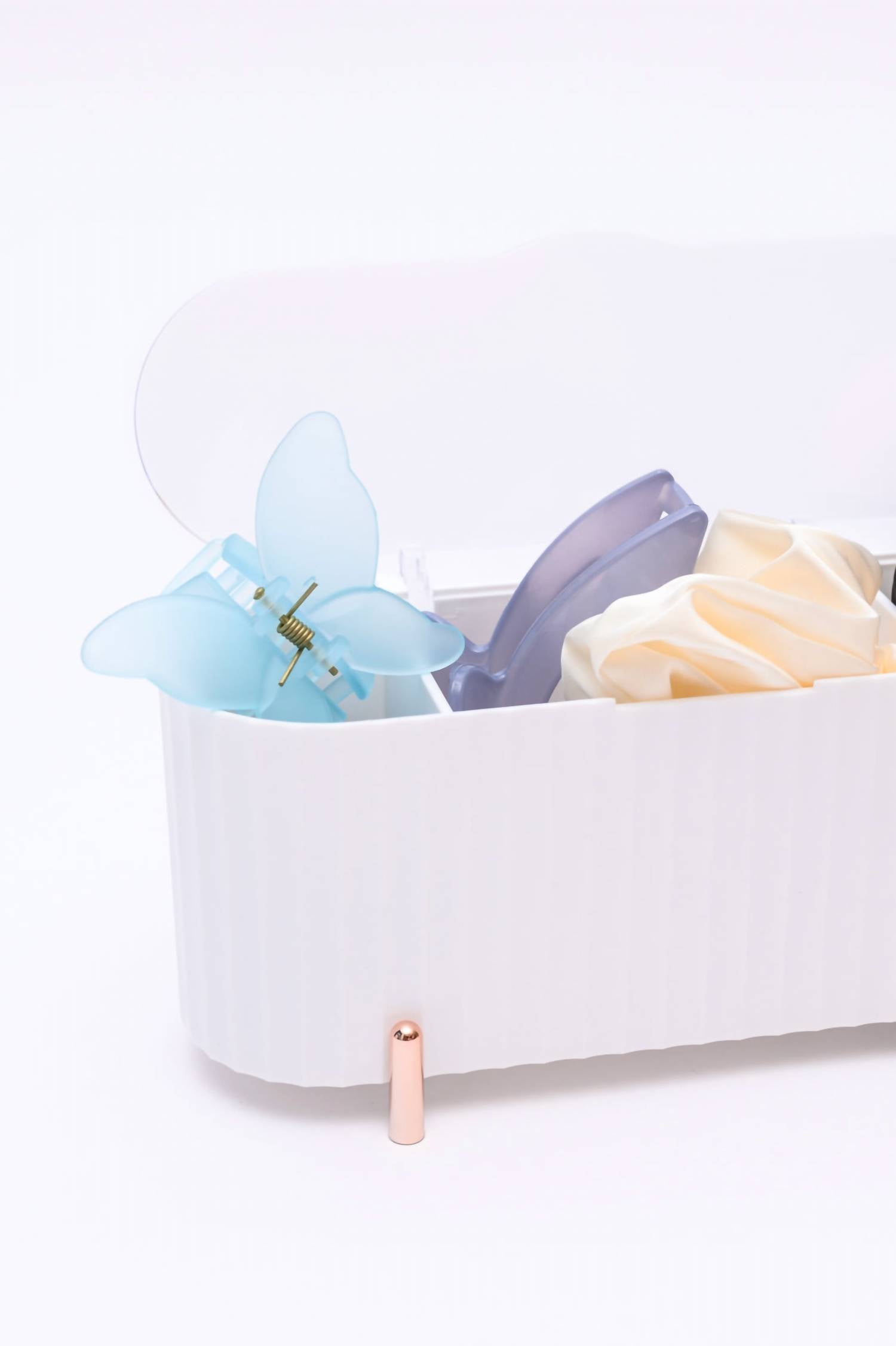 Mini Beauty Organizer in White. Oblong-shaped container. Adorned with dainty gold legs and a crystal-clear lid. Three spacious compartments. Gracefully houses makeup sponges, hair ties, cotton rounds, Q-tips, and other small beauty essentials. 3 Compartments. 8.5 inches wide, 3.5 inches tall.